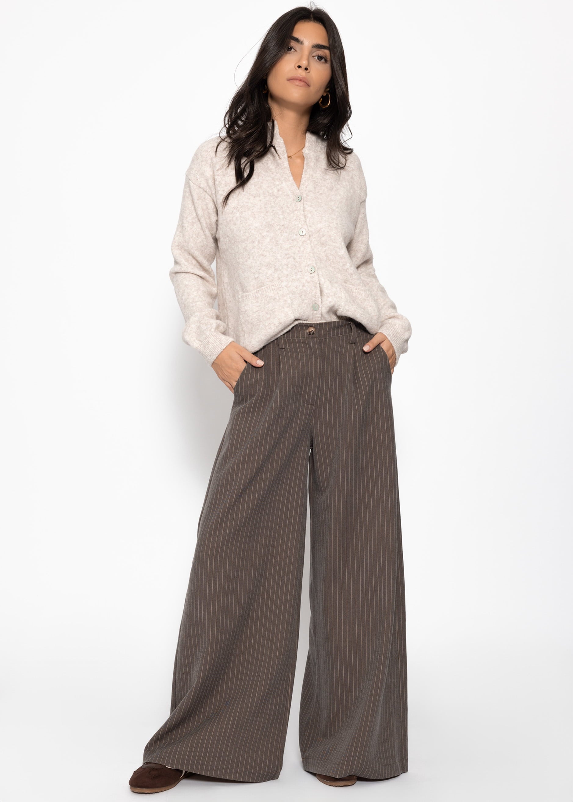 Greige Strickjacke mit aufgesetzten Taschen und durchgehender Knopfleiste. Lockerer Schnitt mit Rundhalsausschnitt und Rippbündchen an Ärmeln und Saum. Weiches Strickmaterial für einen gemütlich-eleganten Look.