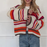 Bunt gestreifte Strickjacke in warmen Orange-, Pink- und Naturtönen mit markantem Querstreifen-Design. Der lockere Schnitt und die grobe Strickoptik sorgen für einen lässigen Look. Der dekorative Schleifenverschluss vorne setzt einen verspielten Akzent.