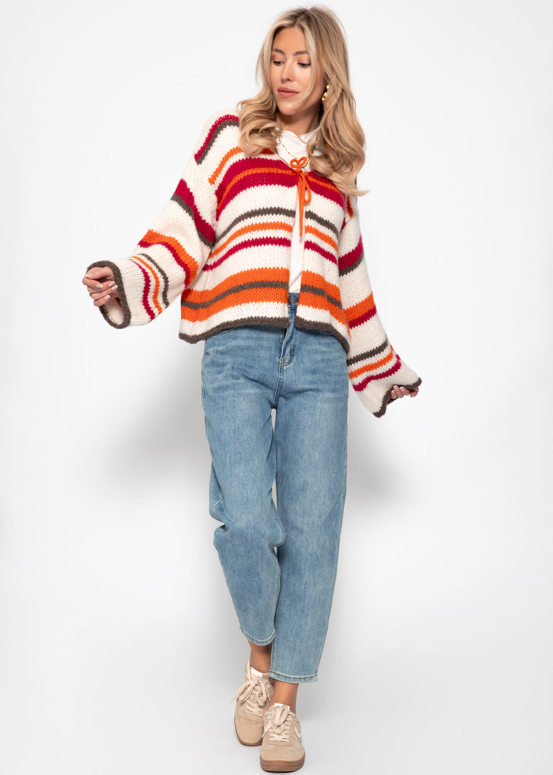Bunt gestreifte Strickjacke mit Schleifenverschluss - orange-pink