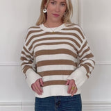 Gestreifter Baumwoll-Pullover in Weiß und Braun mit klassischem Querstreifen-Design. Die feine Strickstruktur aus Baumwolle sorgt für ein angenehmes, natürliches Tragegefühl. Der lockere Schnitt verleiht dem Pullover eine zeitlose, entspannte Ausstrahlung.