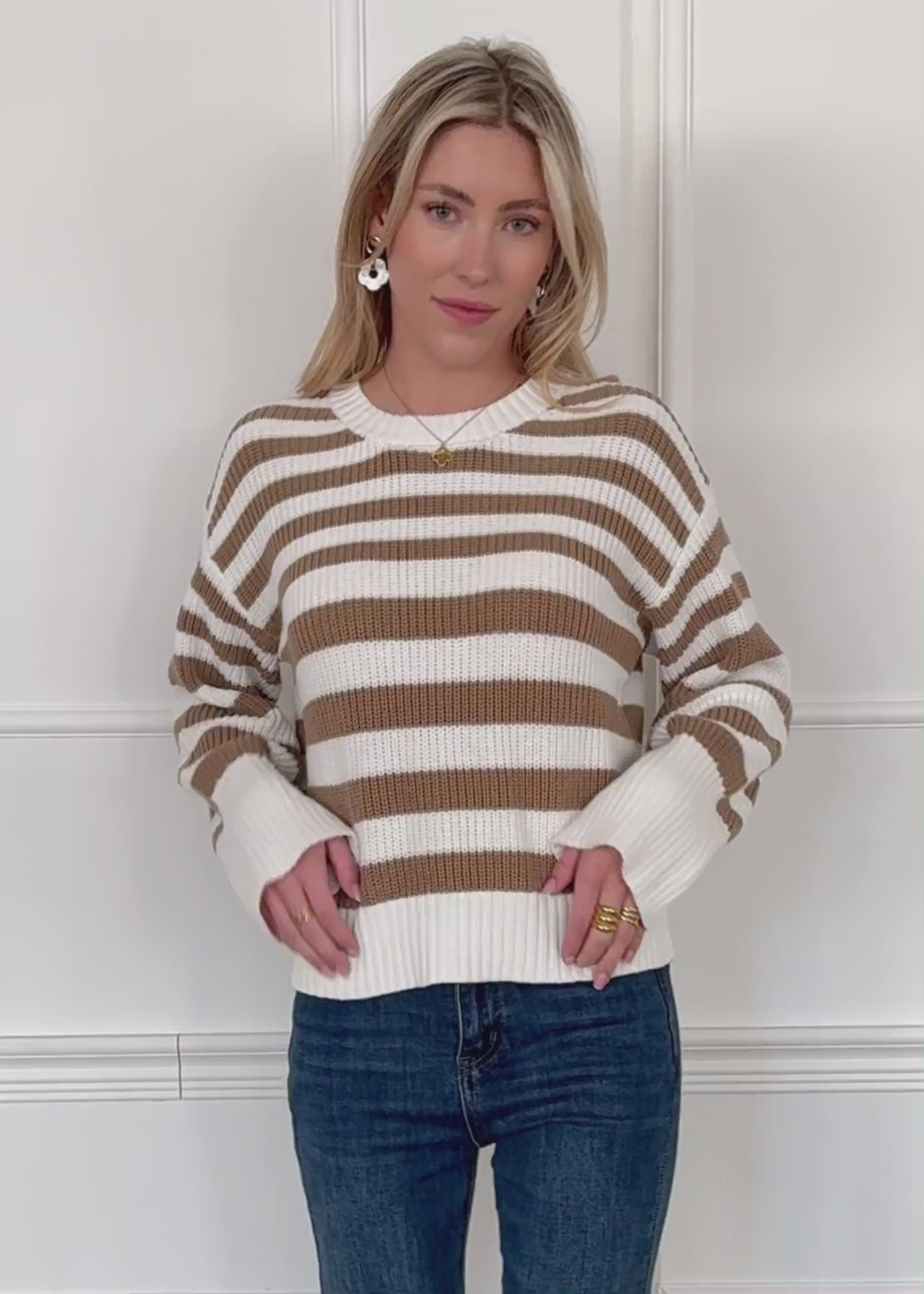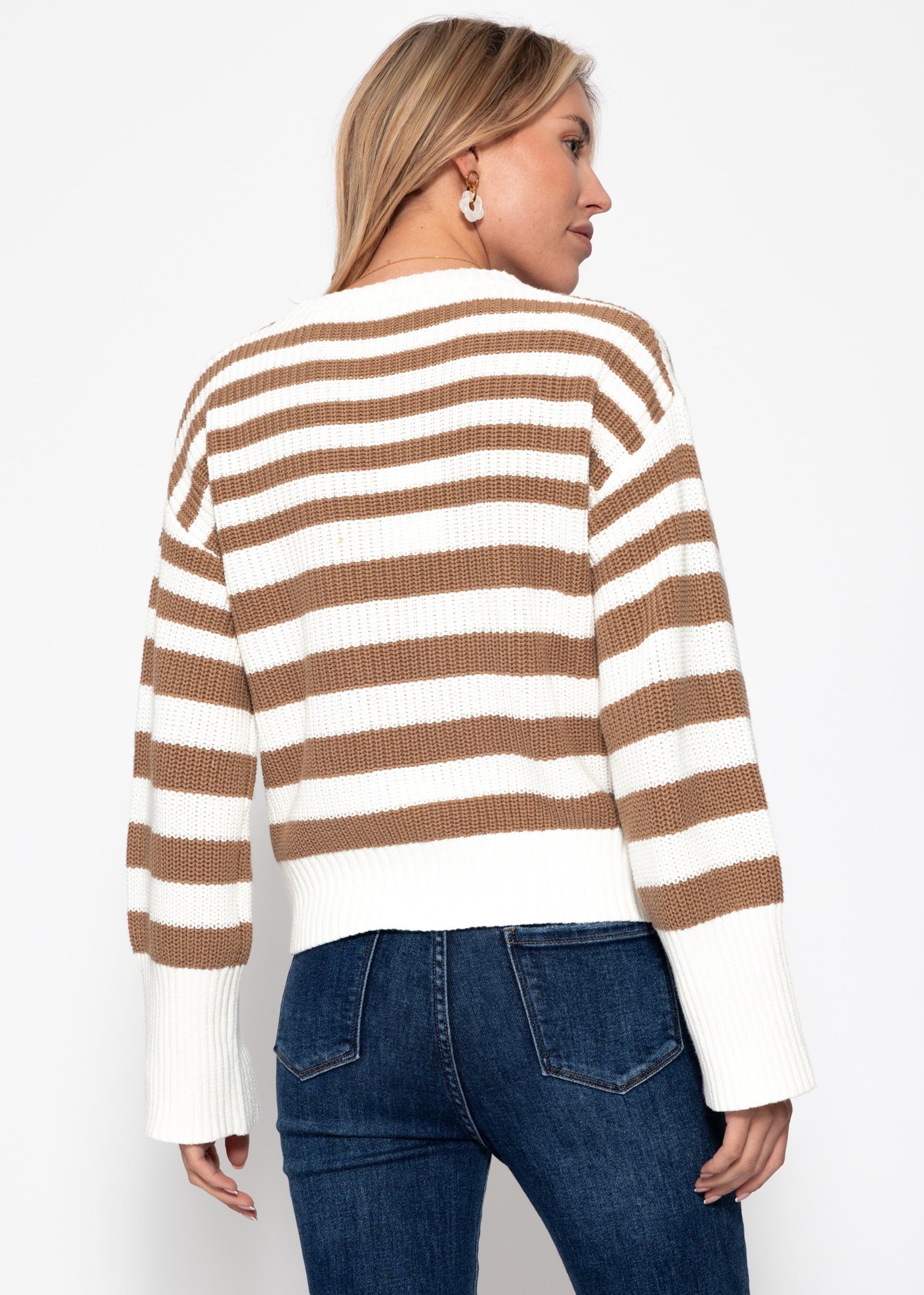 Gestreifter Baumwoll-Pullover - weiß-braun