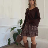 Brauner Rock mit feinem Blumenprint und doppellagigem Volant-Saum. Leichtes, fließendes Material mit elastischem Bund für bequemen Sitz.