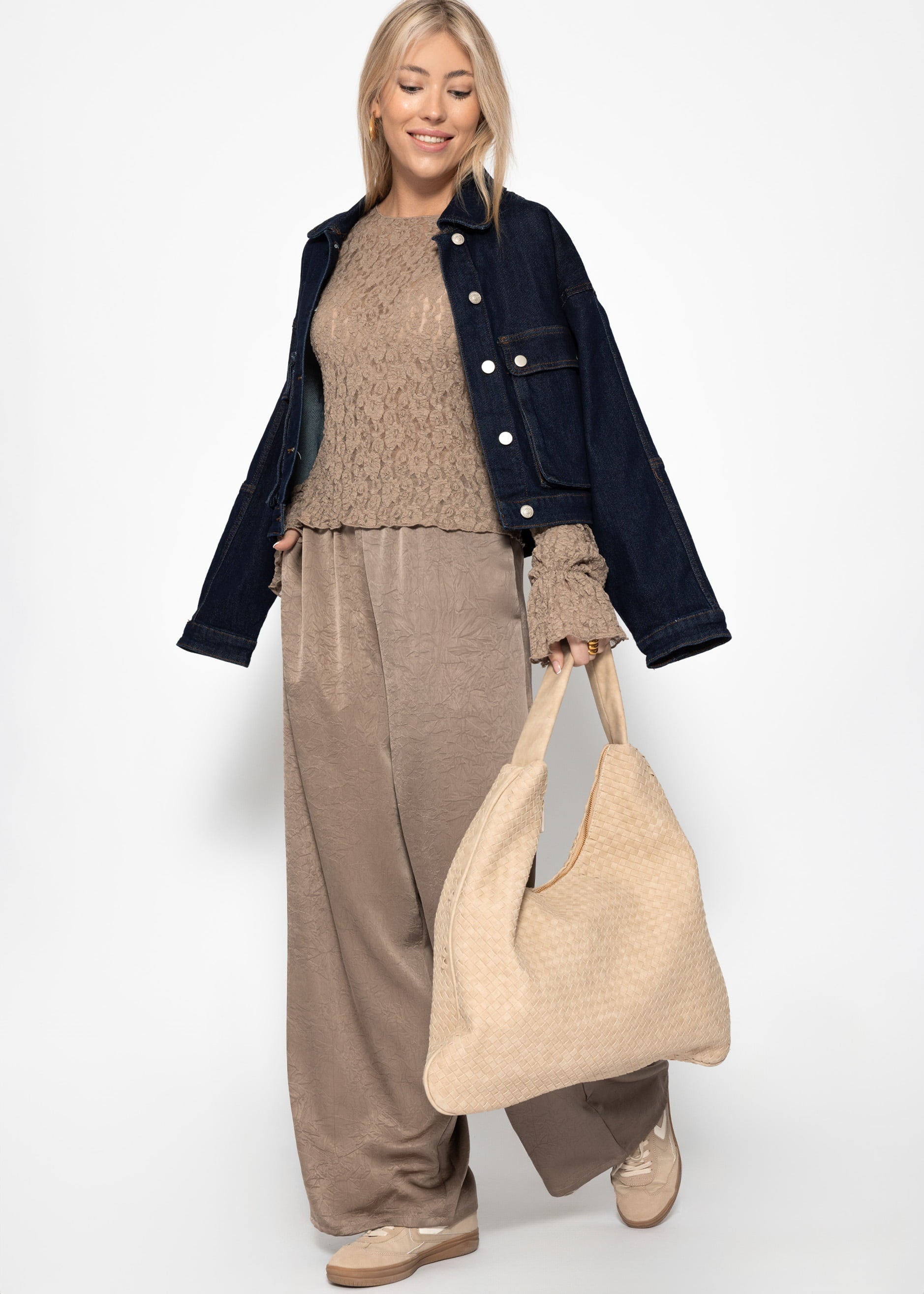 Feminin strukturiertes Langarmshirt in Taupe mit feiner Spitzenoptik und zarten Volantärmeln. Die leicht transparente, strukturierte Oberfläche verleiht dem Design eine elegante Leichtigkeit. Ein stilvolles Piece, das sich perfekt für moderne Layering-Looks oder solo getragen eignet.