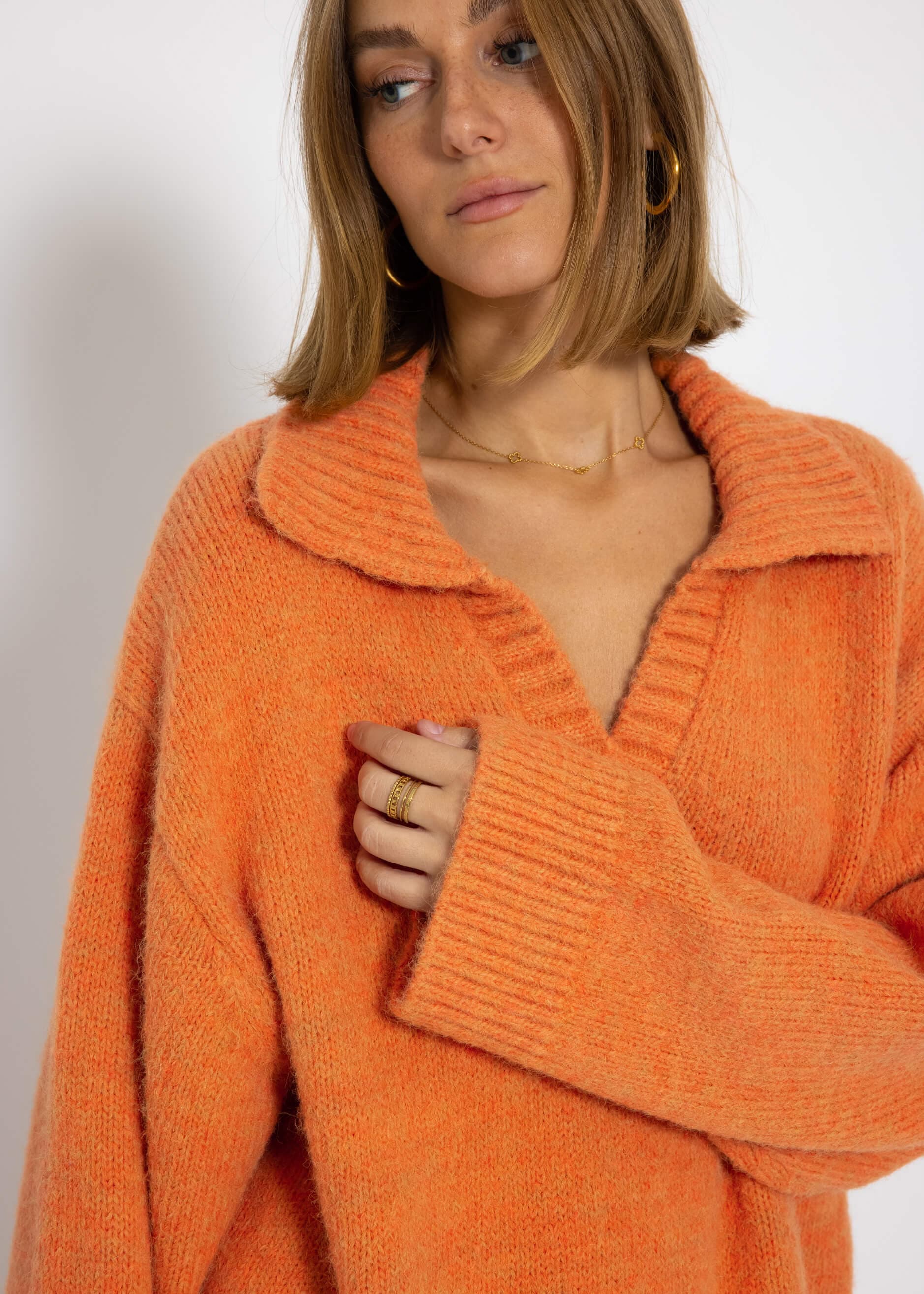 Dieser Pullover verkörpert die zeitlose Schönheit, die durch modernen Stil ergänzt wird. Das Modell besitzt eine Oversized-Passform, überschnittene Schultern sowie weite Ärmel, die für Lässigkeit sorgen. Kragen und V-Ausschnitt verleihen dem Pullover einen angesagten Touch, während gerippte Abschlüsse das Design gekonnt komplementieren. Dieser vielseitige Strickpullover harmoniert perfekt mit einer schönen Jeans oder Leggings für den perfekten Alltagslook.