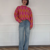 Gestrickter Pullover mit markantem Argyle-Muster in Pink und Orange. Lockerer, leicht kastiger Schnitt mit Rundhalsausschnitt und langen Ärmeln. Weiche Haptik und kontrastierende Rautendetails für einen modernen Look.