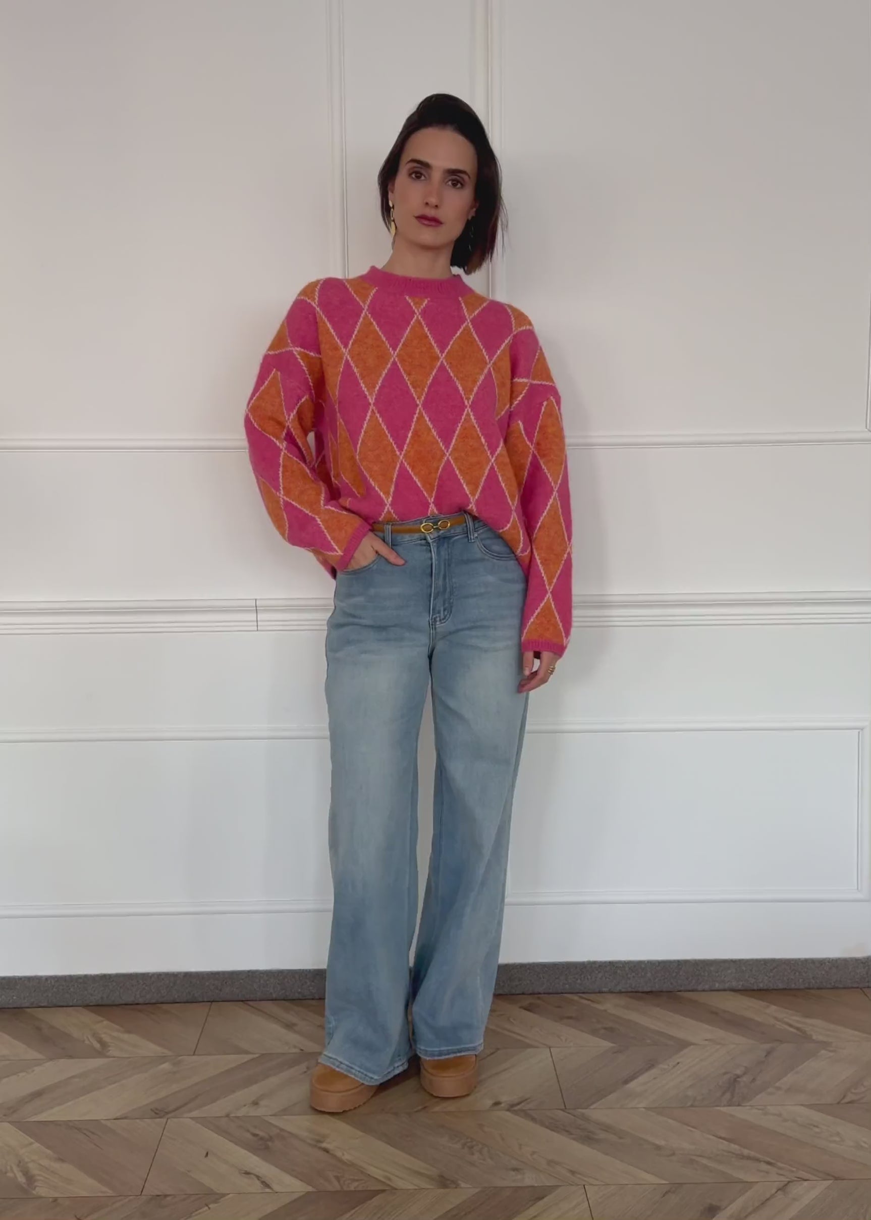 Oversize Strickpullover mit Rautenmuster in Pink und Orange