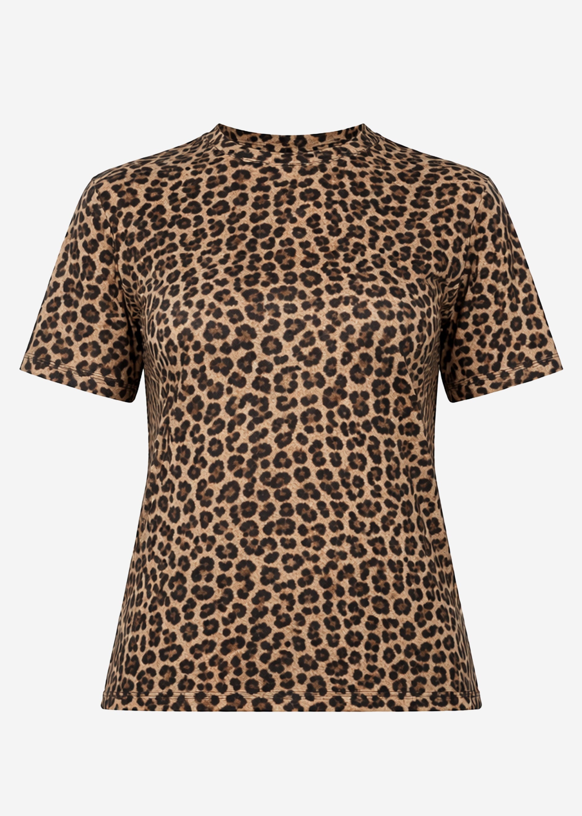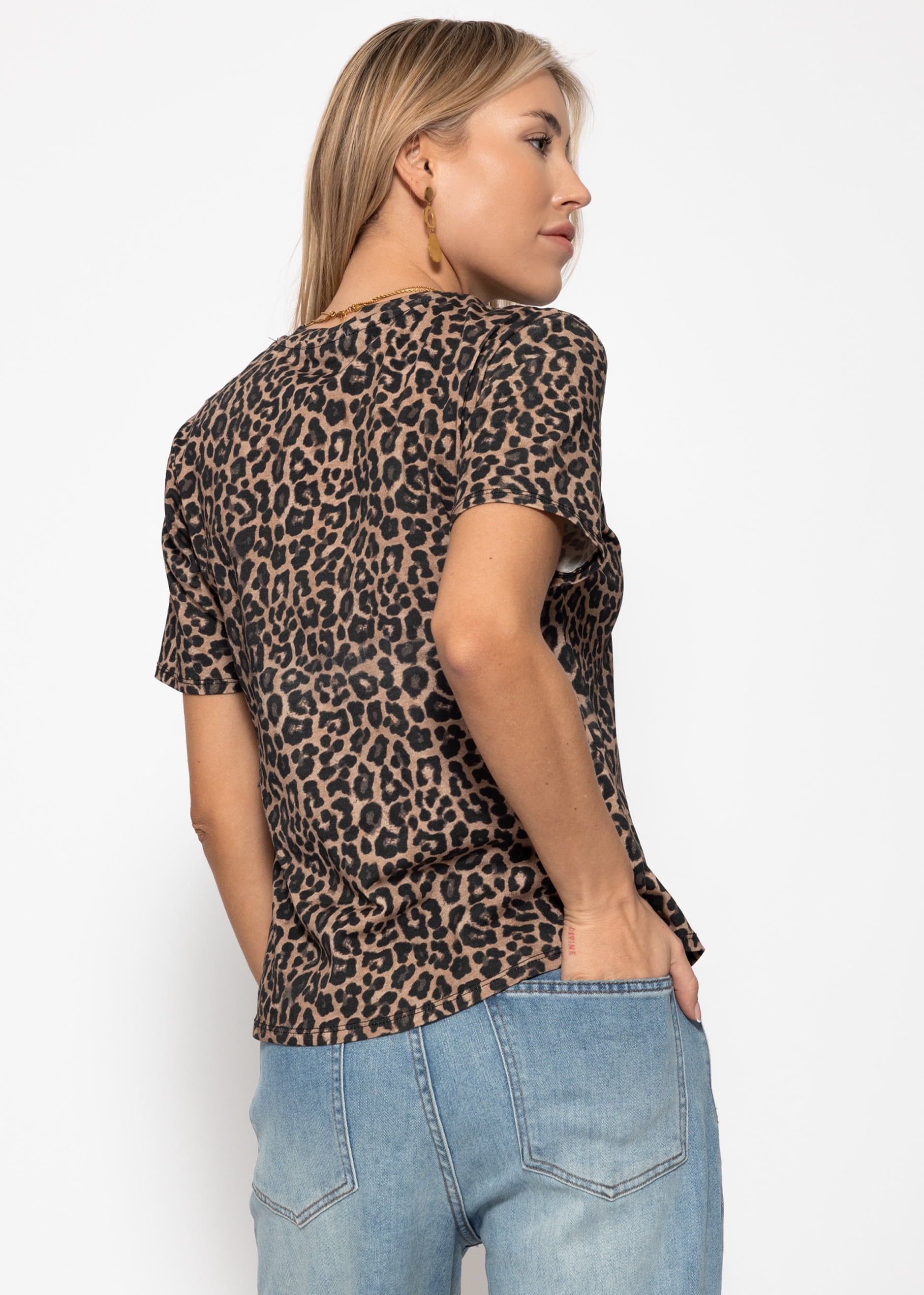 T-Shirt mit angesagtem Leo-Print in Braun. Der figurbetonte Schnitt und der klassische Rundhalsausschnitt sorgen für eine zeitlose Silhouette, während das auffällige Muster dem Look eine trendstarke Note verleiht. Perfekt kombinierbar zu Jeans, Röcken oder unter Blazern für stylische Alltags-Outfits.