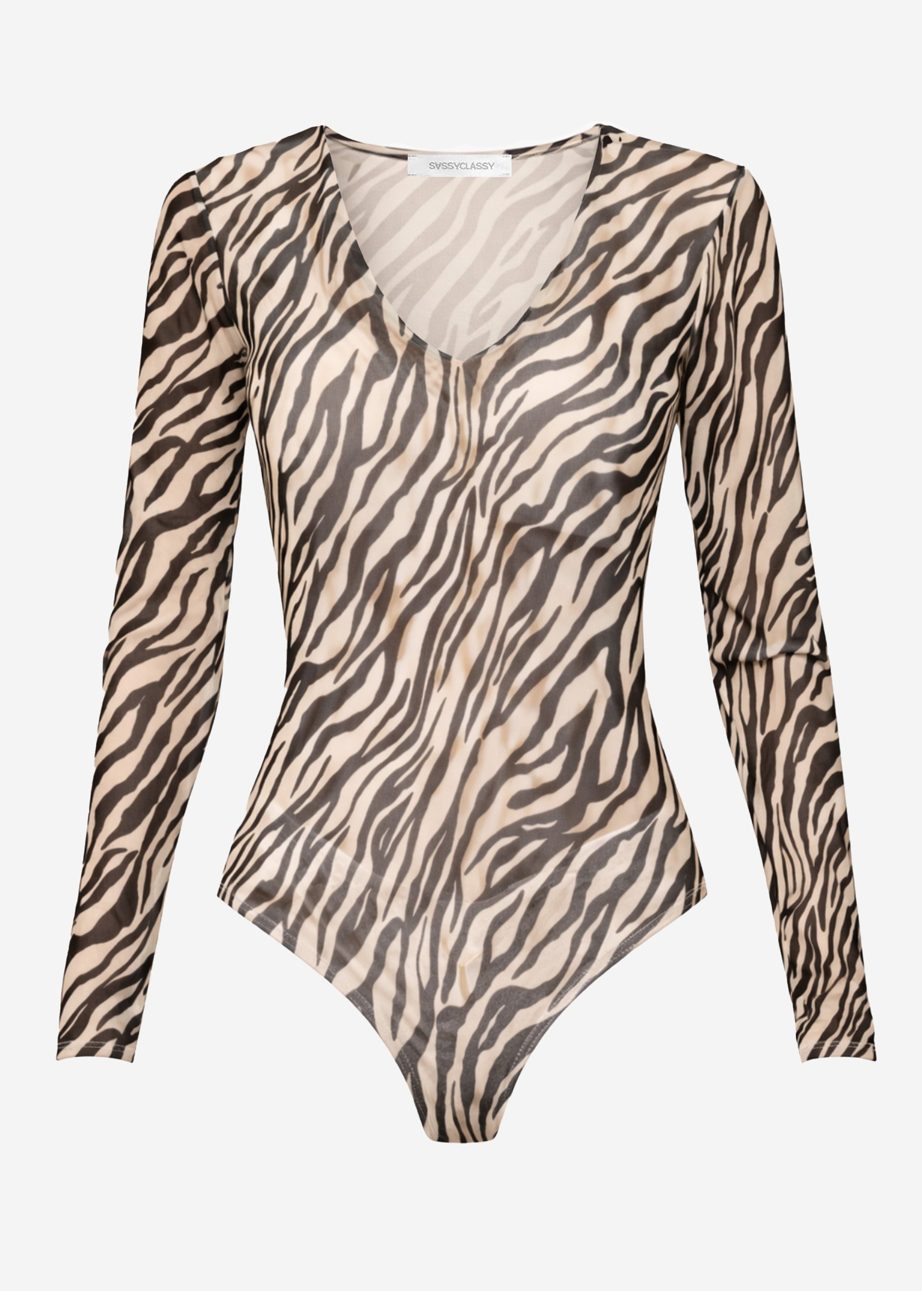 Figurbetonter Body mit auffälligem Zebra-Print. Tiefer V-Ausschnitt und lange Ärmel unterstreichen die feminine Silhouette, während das elastische Material für eine anschmiegsame Passform sorgt. Vorne ist der Body gefüttert.