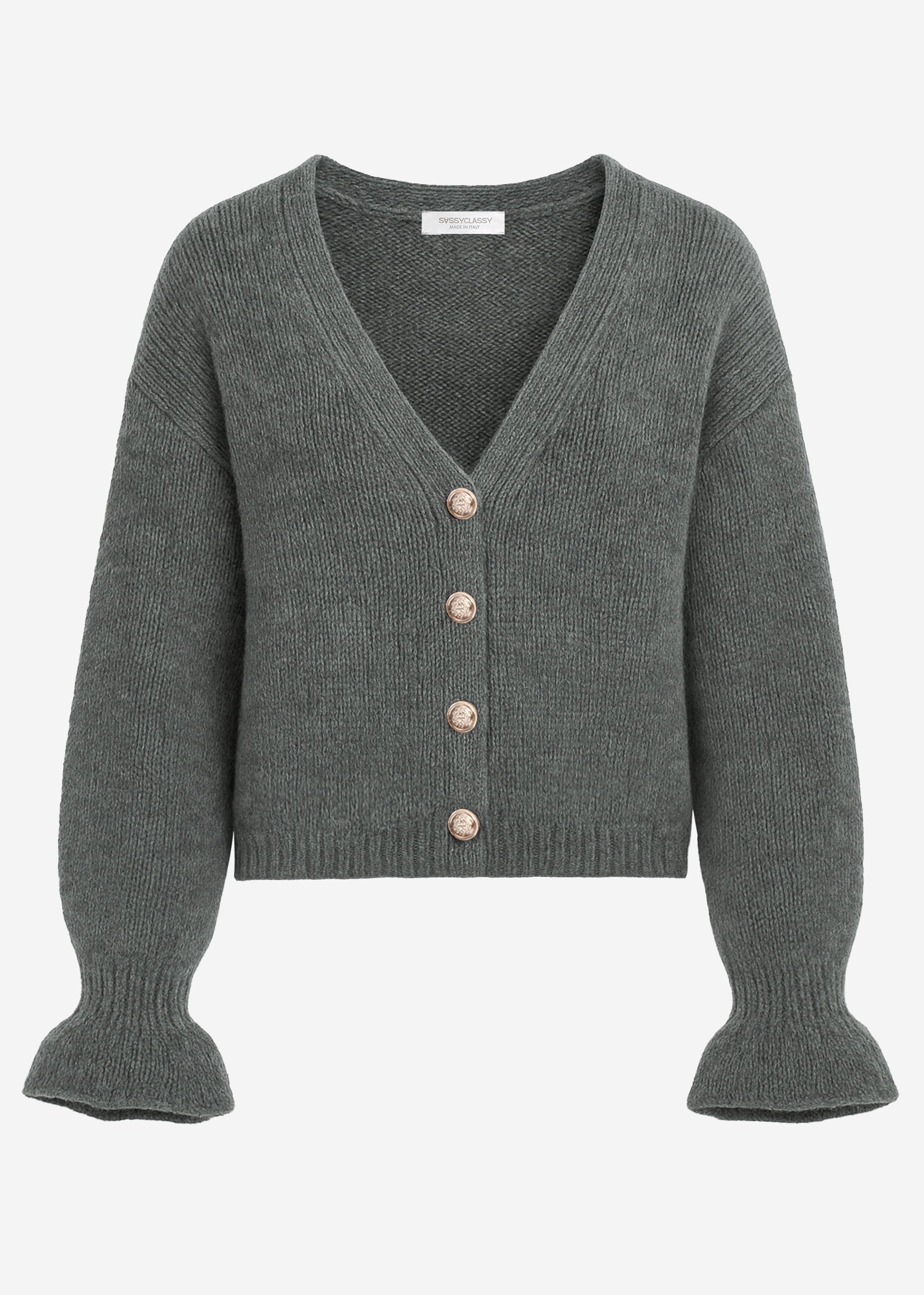 Dieser Cardigan überzeugt durch seine lässige Passform und den gemütlichen Strick. Die langen Ärmel mit Volants verleihen dem Modell eine feminine Note und eine leicht ballonartige Silhouette.