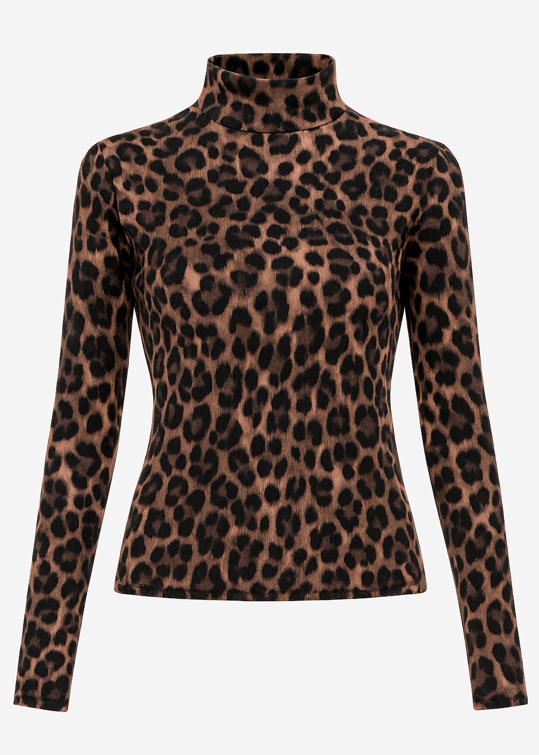 Leoprint-Langarmshirt mit schmalem Stehkragen und figurbetonter Silhouette. Weiches, leicht elastisches Material für angenehmen Tragekomfort. Perfekt als Statement-Piece für Layering-Looks.