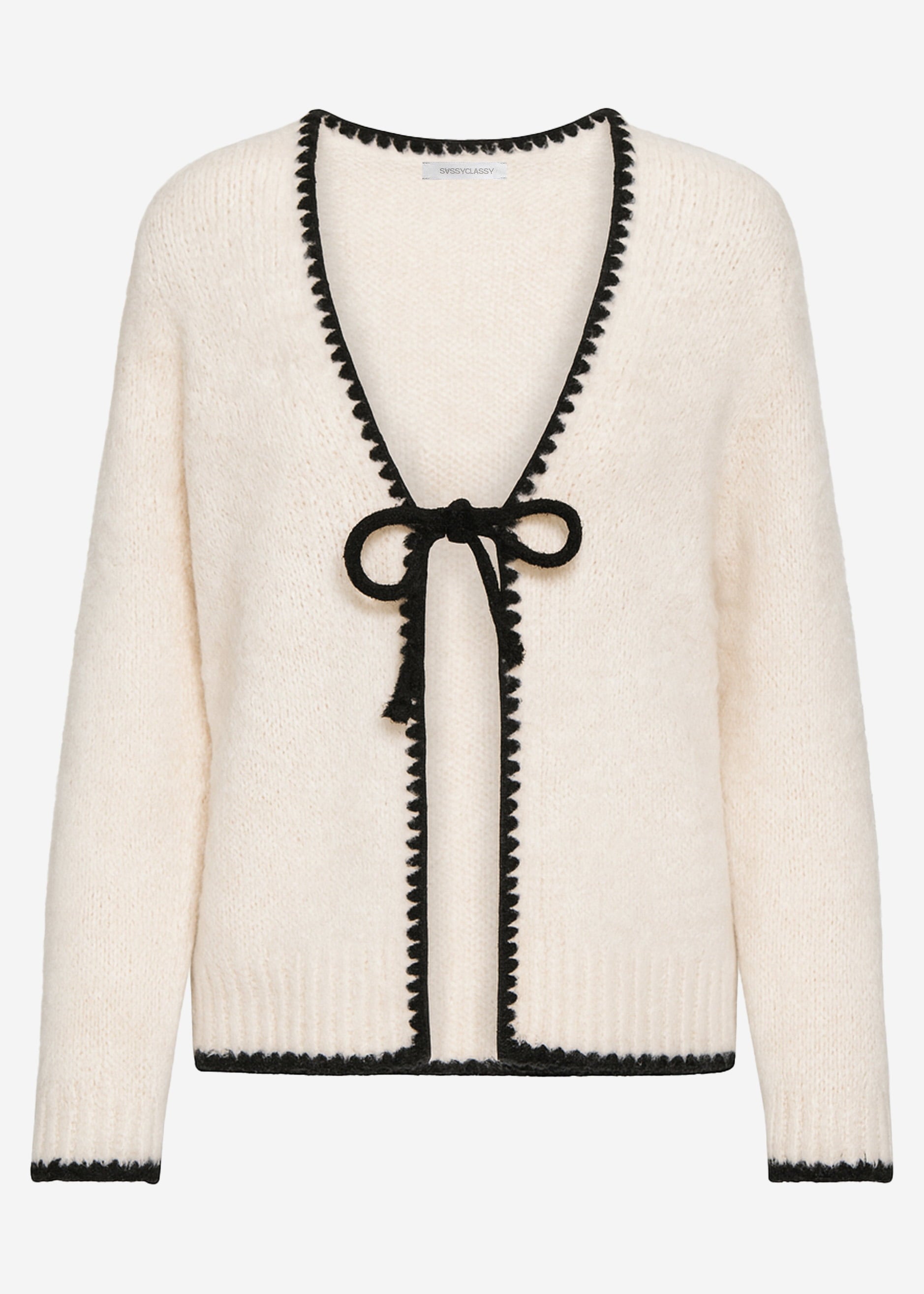 Beiger Cardigan mit schwarzer Kontrastkante und Schleifenverschluss. Kuscheliges Strickmaterial mit V-Ausschnitt und Rippbündchen an Ärmeln und Saum. Femininer Look mit verspieltem Detail.