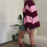 Dieser gestreifte, lockere Cardigan aus weichem Strick in Burgundy besticht durch seine Oversized-Passform, den offen fallenden Schnitt und überschnittene Schultern. Rippbündchen an den Ärmeln und ein gerippter Saum runden das Design ab.