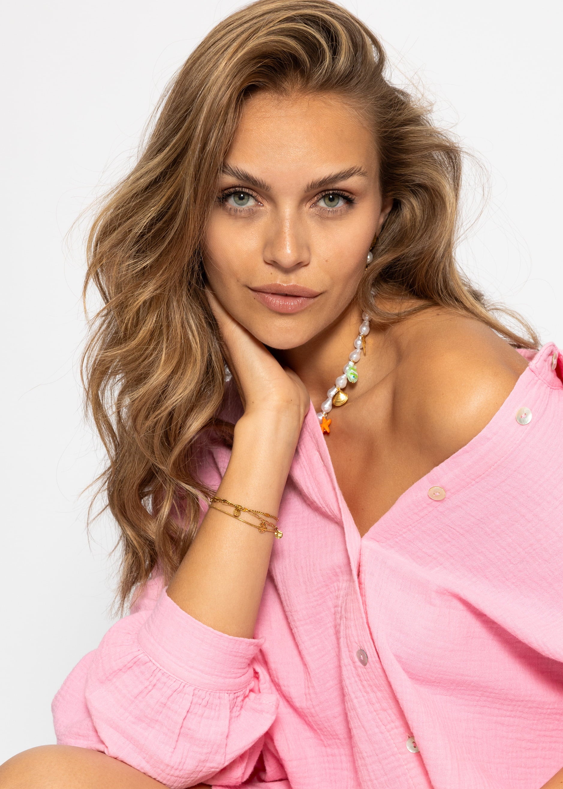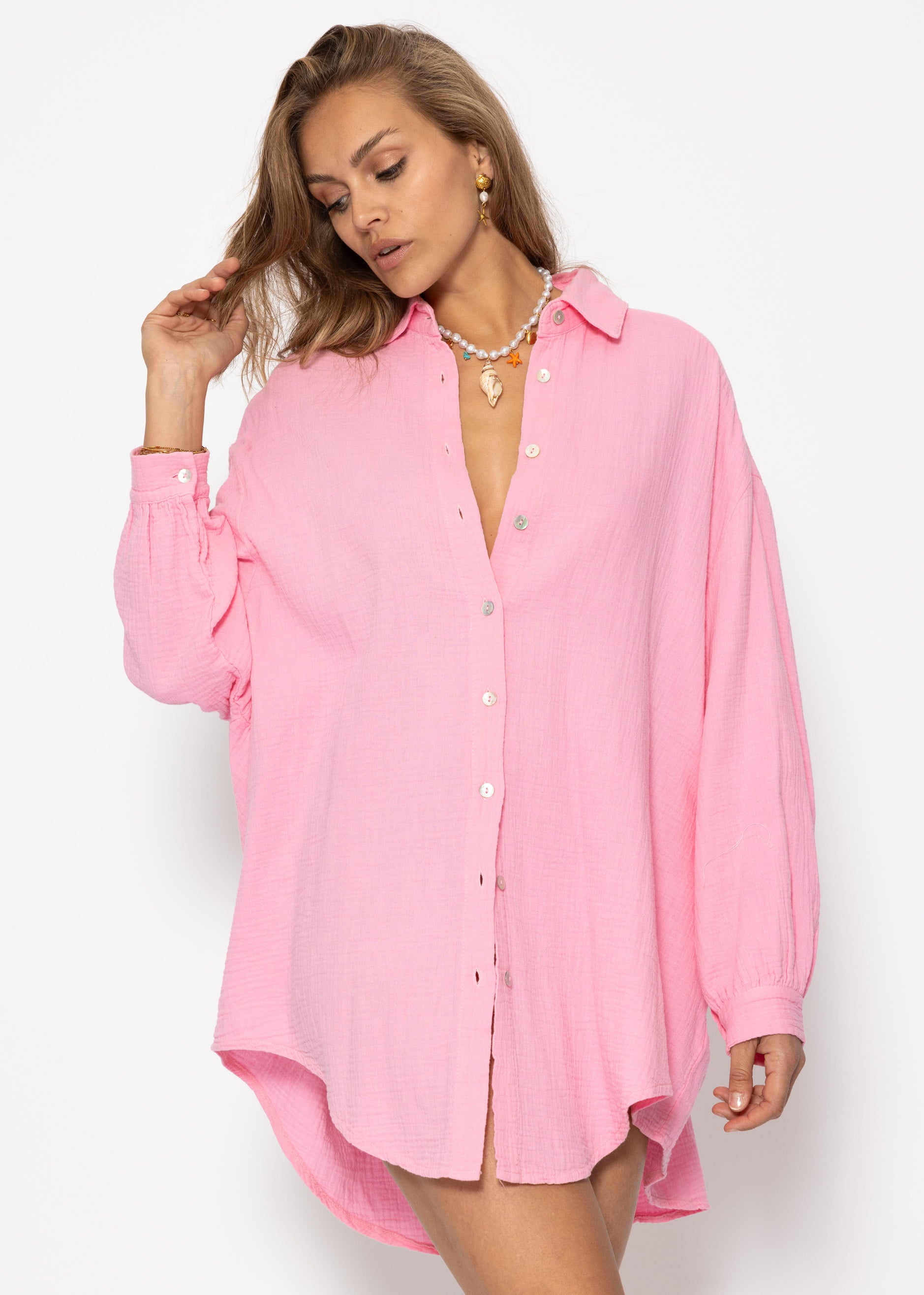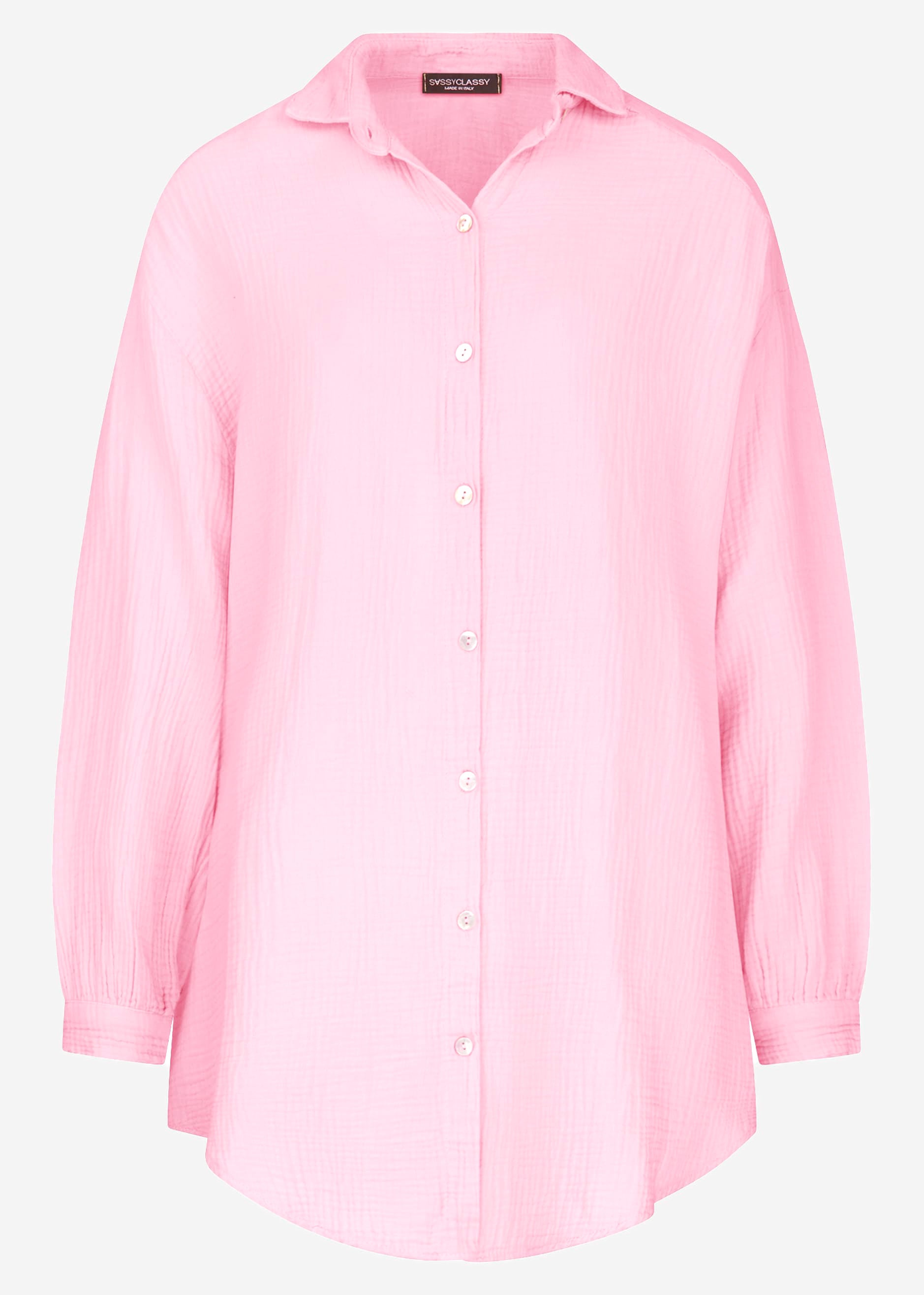 Locker fallendes Blusenhemd in Babyrosa aus leichtem, hochwertigem Baumwoll-Musselin mit Perlmuttknöpfen. Bei diesem Modell handelt es sich um die lange Variante unserer Musselinbluse. Die stylische Longbluse besteht aus dem super soften, angenehmen und atmungsaktiven Trendstoff Musselin und ist daher ein absolutes Must-Have. Sie ist schön oversize geschnitten, fällt hinten etwas länger als vorne und besitzt überschnittene Schultern, wodurch sie ihren lässigen Look erhält. Der Kragen, der Knopfverschluss, Manschetten an den langen Ärmeln sowie die querlaufende Falte am Rücken verleihen der Musselinbluse besondere, liebevolle Details und geben ihr einen eleganten Touch. Sie ist ein treuer Begleiter für jede Jahreszeit und du kannst sie vielseitig kombinieren. Trage sie klassisch als Bluse, offen als Jacke oder Cardigan-Ersatz über einem Top, als Kleid, unter einem Pullover für einen zeitlosen Layering-Look oder einfach trendig geknotet mit tiefem Ausschnitt über einen schönen Spitzen-BH. Dieser raffinierte Allrounder kommt in Einheitsgröße und wird bis Größe 48 empfohlen.