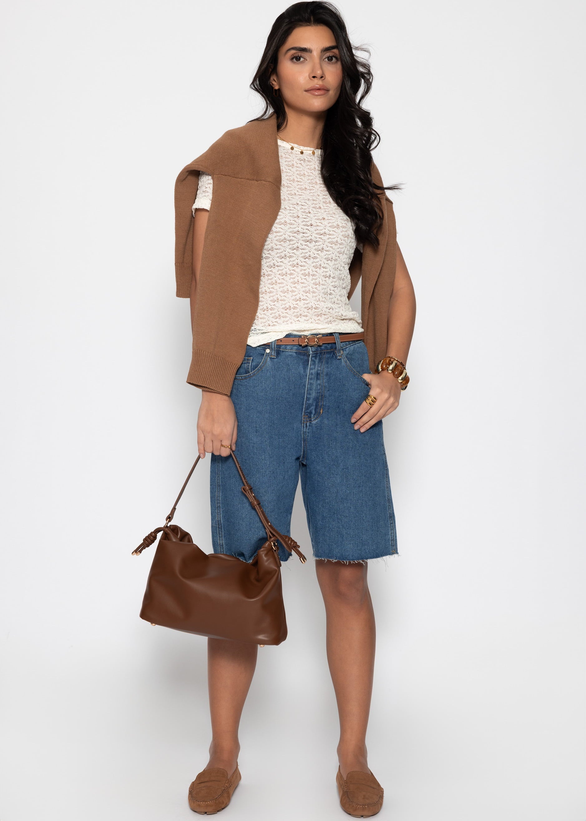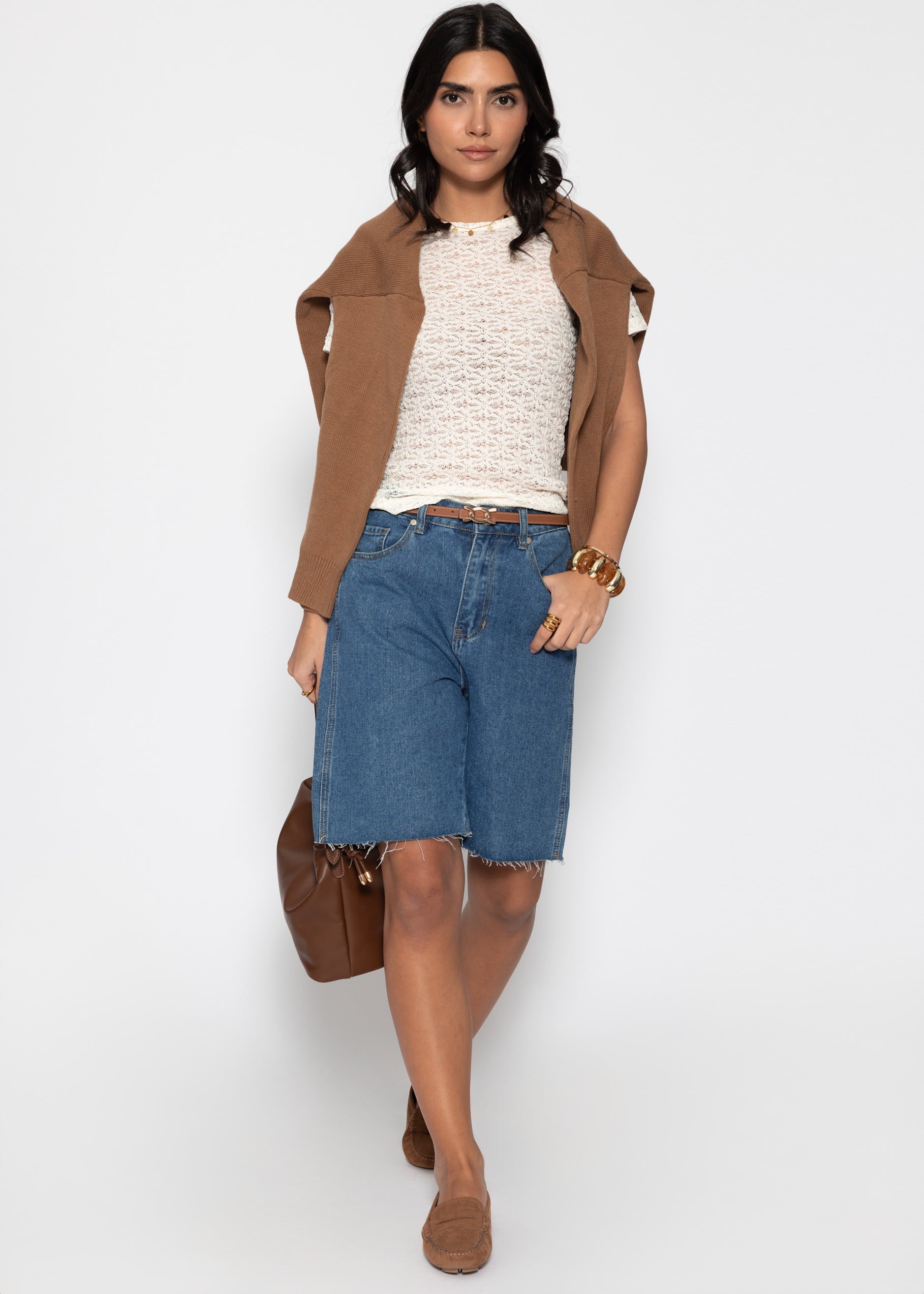 Feminin geschnittenes T-Shirt aus floraler Spitze in zartem Offwhite. Feines, durchbrochenes Blumenmuster allover mit klassischem Rundhalsausschnitt und kurzen Ärmeln. Leicht transparente Struktur für einen eleganten, romantischen Look.