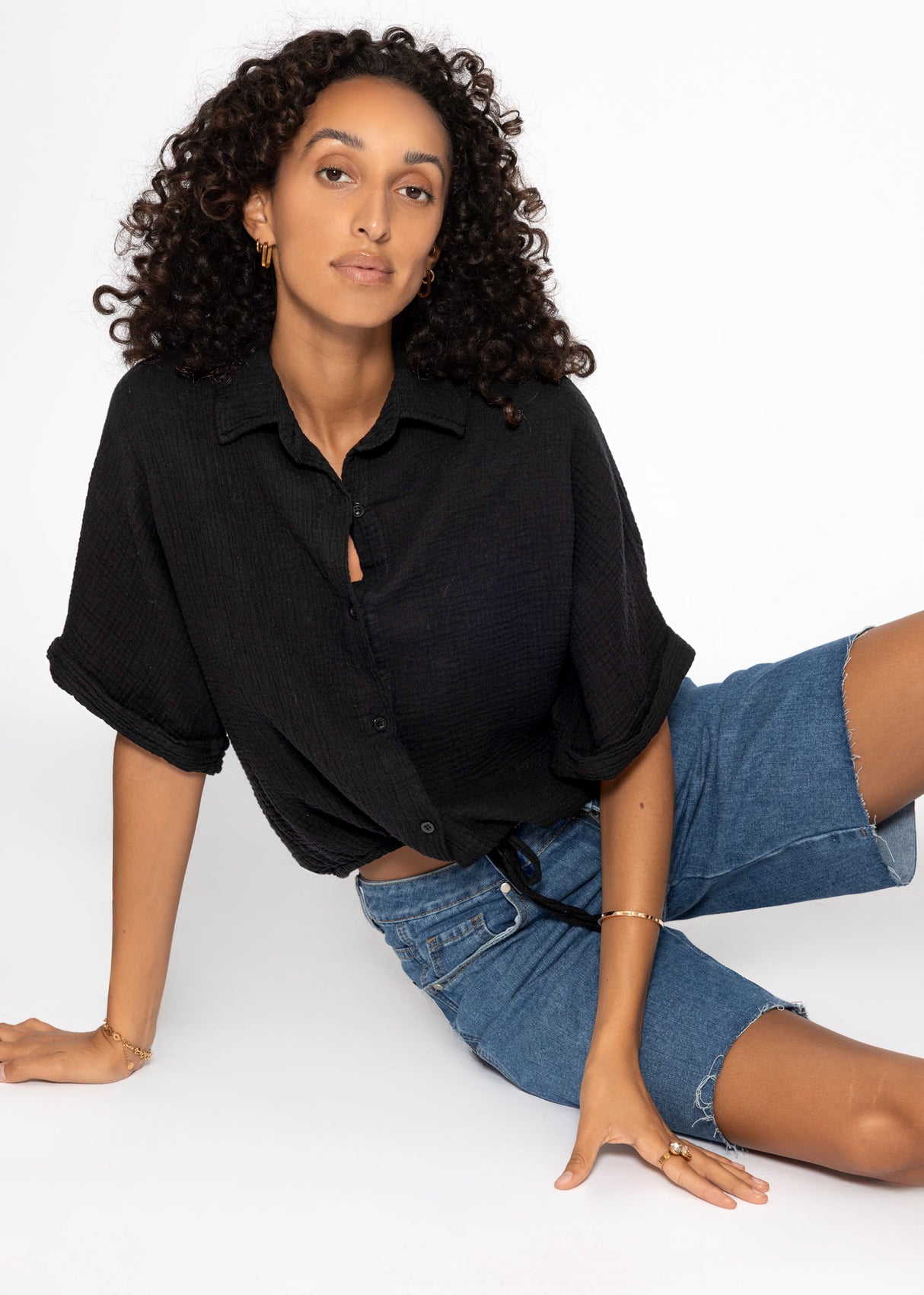 Leicht, luftig und absolut im Trend: Diese Musselinbluse ist der perfekte Begleiter für warme Tage. Der weiche Stoff aus Baumwolle fühlt sich angenehm auf der Haut an und verleiht der Bluse ihre charakteristische, leicht strukturierte Optik. Dank ihrer lockeren Passform, dem klassischen Hemdkragen und den überschnittenen Schultern wirkt sie lässig und zugleich feminin. Das praktische Zugband am Saum ermöglicht eine individuelle Passform und setzt die Taille gekonnt in Szene. Ob zu Shorts, Röcken oder einer High-Waist-Hose – diese Bluse lässt sich vielseitig kombinieren und bringt sommerliche Leichtigkeit in jedes Outfit.