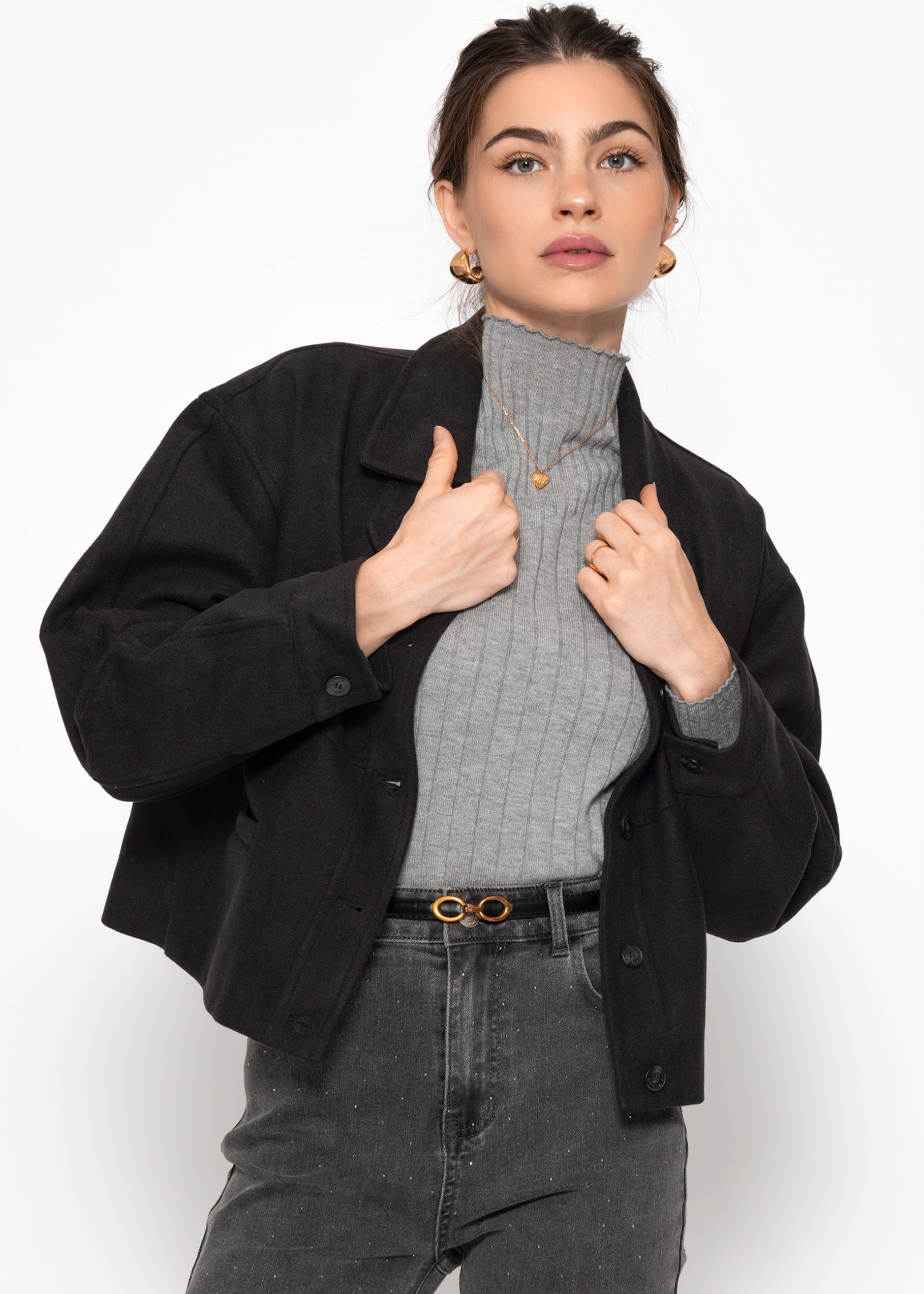 Diese hochwertige, kurze Jacke in Schwarz besitzt eine moderne, kastige Silhouette mit klarer Linienführung. Sie ist innen gefüttert und verfügt über eine Knopfleiste, einen klassischen Kragen und schmale Manschetten.
