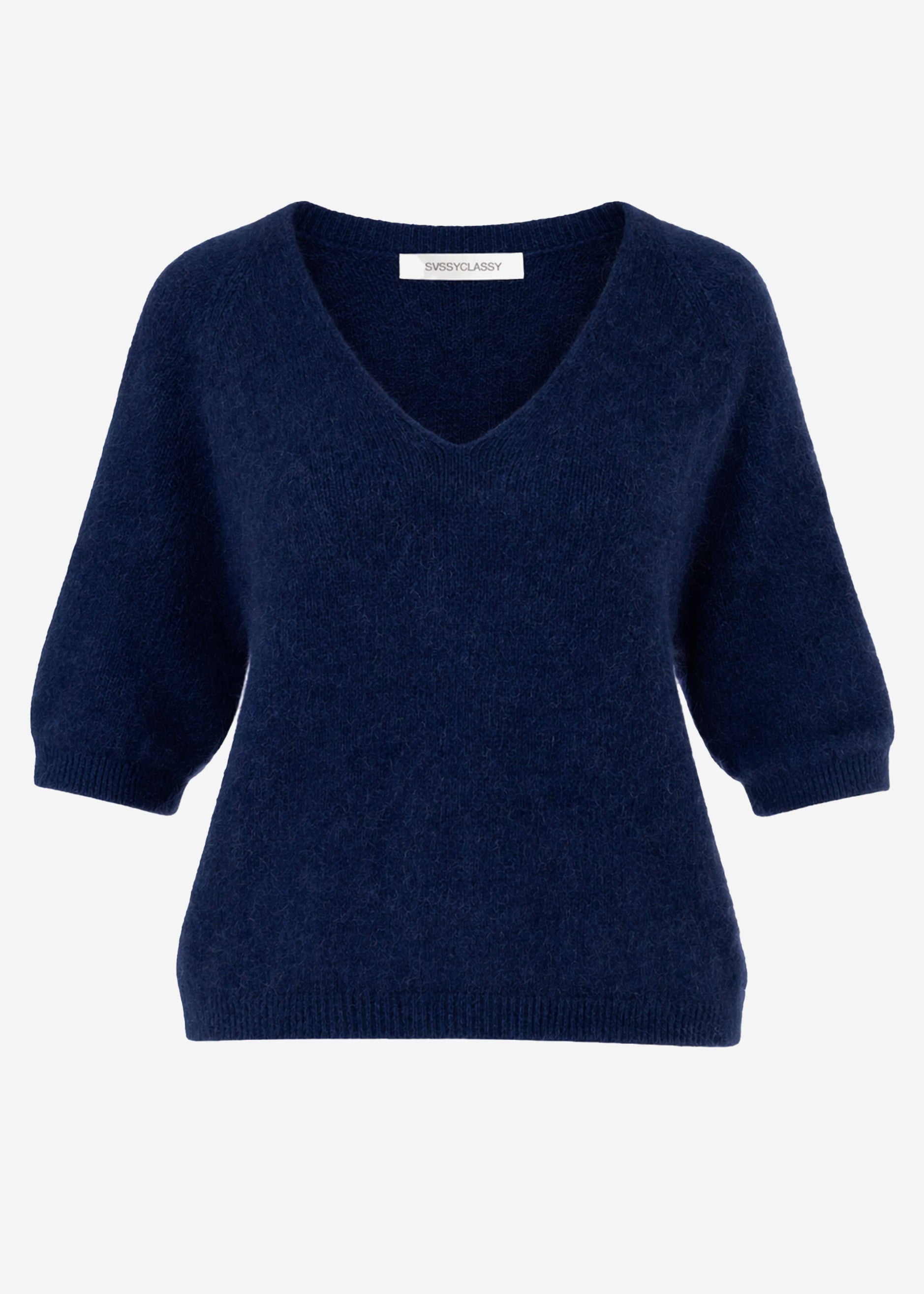 Feinstrick-Pullover in Dunkelblau. V-Ausschnitt und halblange Ärmel mit gerippten Abschlüssen sorgen für eine feminine Silhouette. Weiche Strickqualität und lockerer Schnitt für eine bequeme Passform.