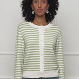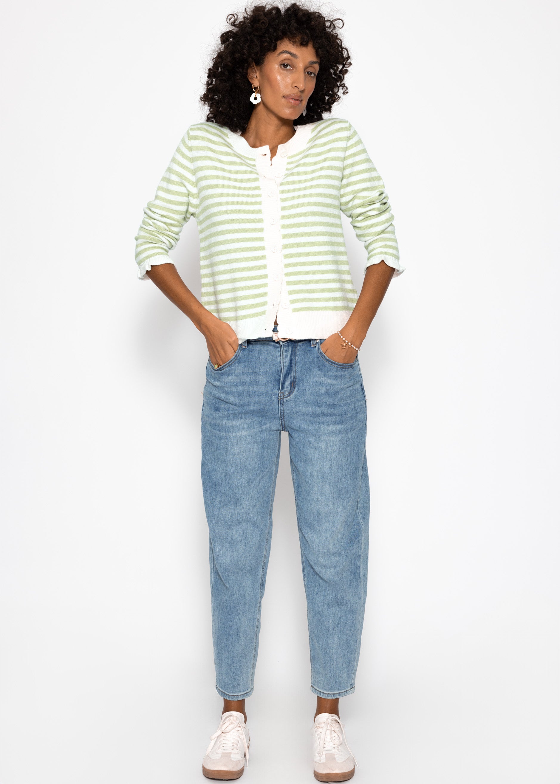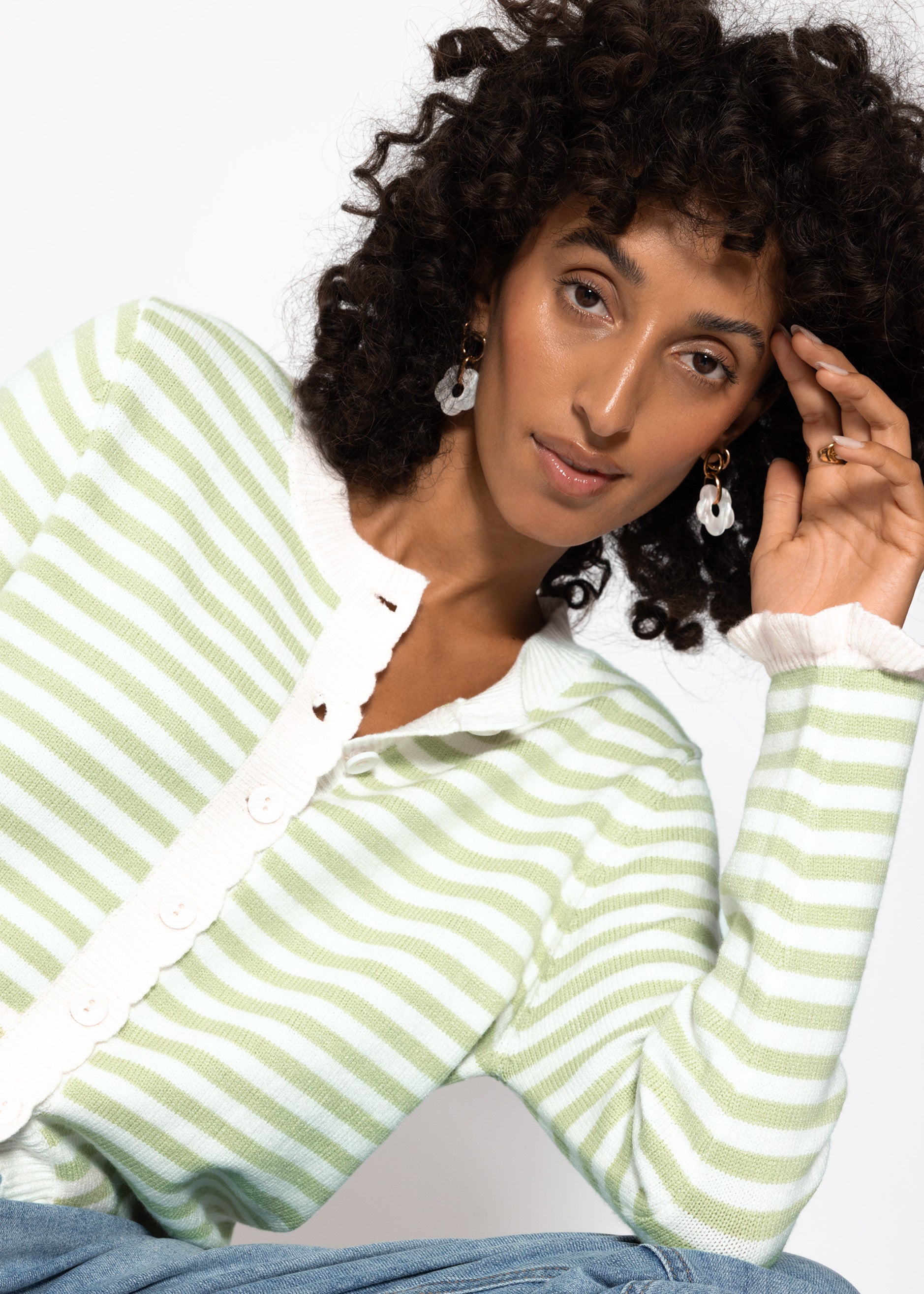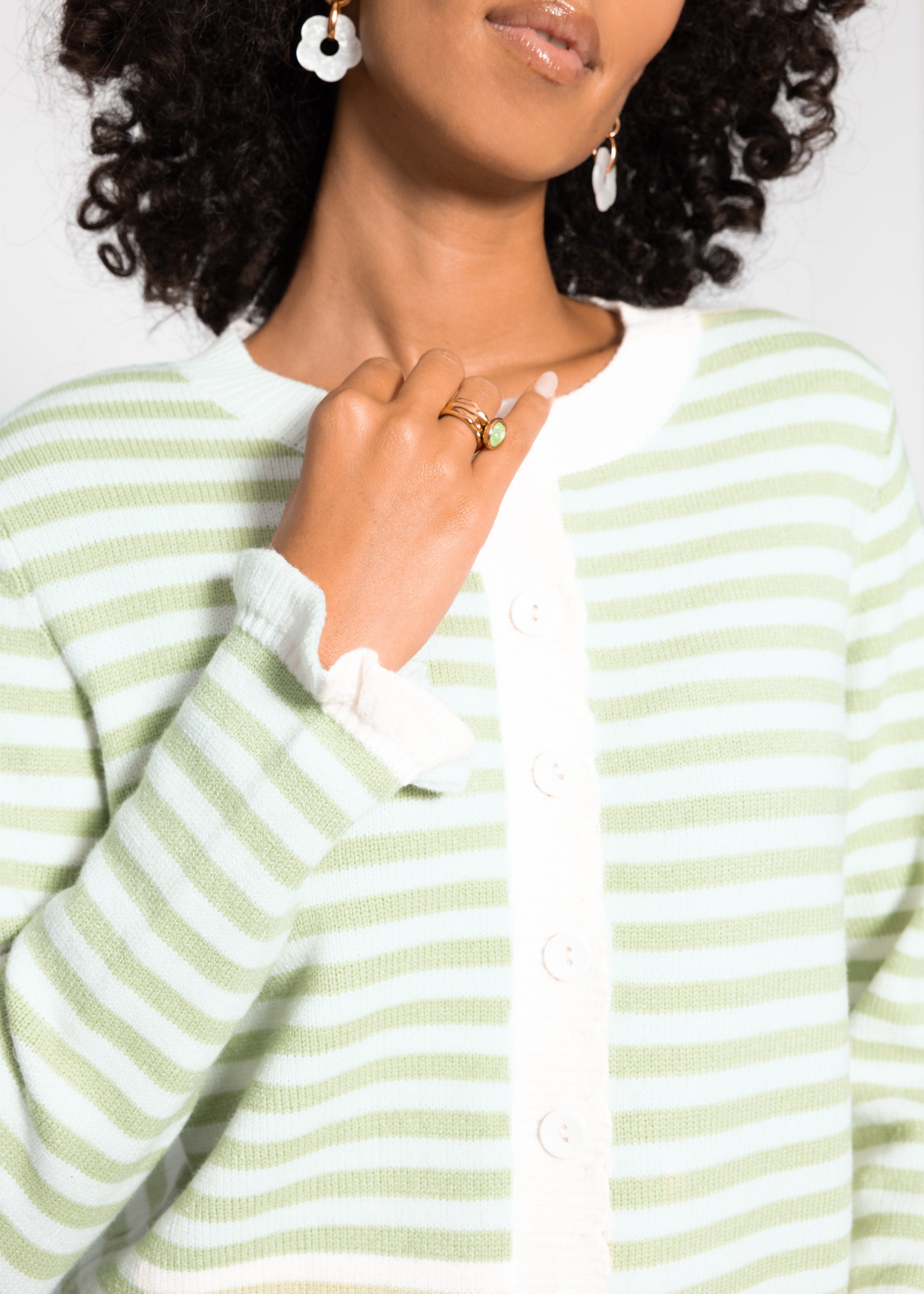 Strickjacke mit feinem Streifenmuster und durchgehender Knopfleiste. Zarte Volants an den Ärmelabschlüssen sowie die Bogenkante entlang der Knopfleiste setzen feminine Akzente, während gerippte Bündchen an Saum und Rundhalsausschnitt für eine strukturierte Passform sorgen.