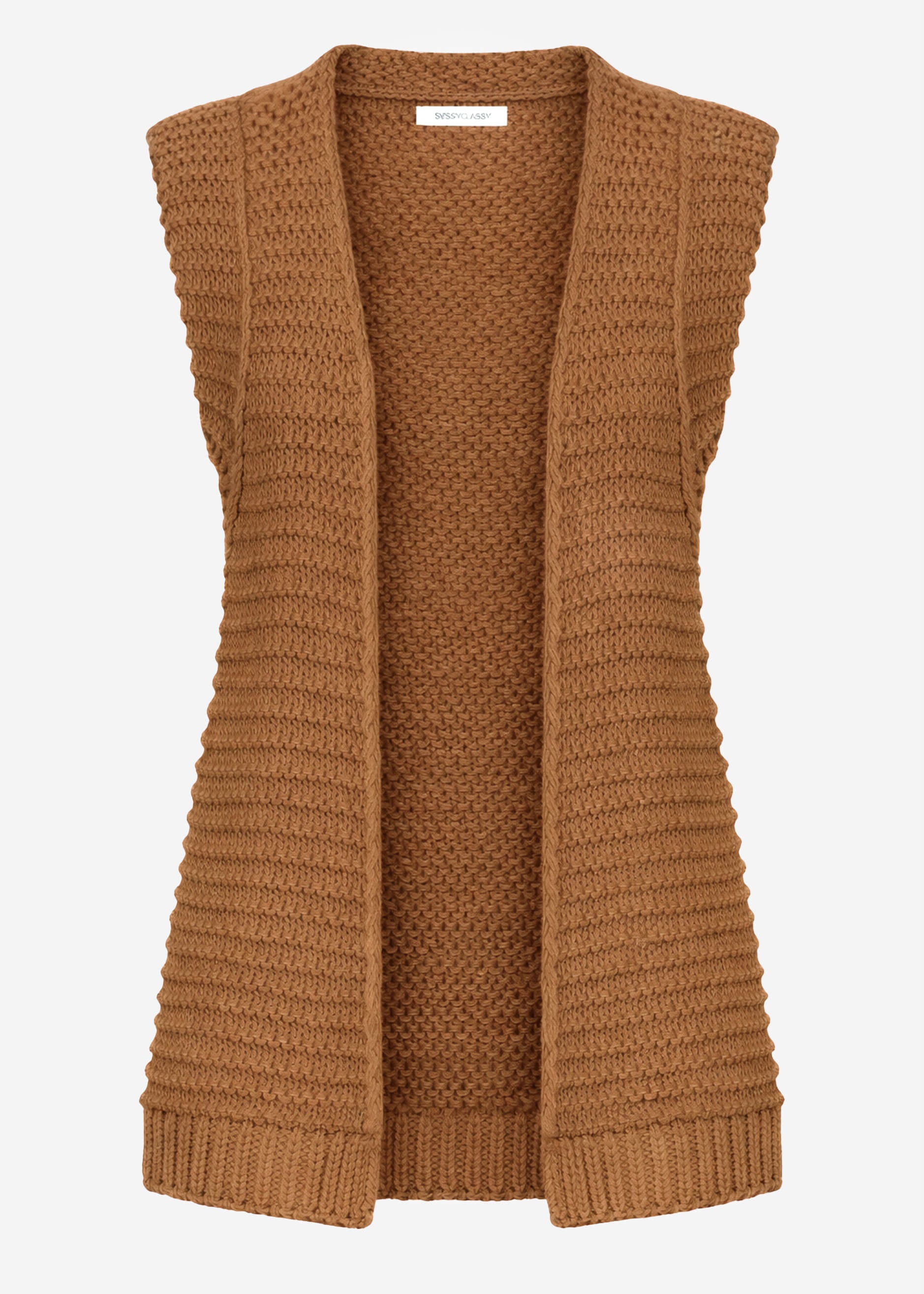 Diese ärmellose, lange Strickweste in Camel hat eine Schulterpartie mit breiten Blenden. Ihr grob gestricktes Design verleiht der offen fallenden Weste eine moderne und lässige Optik mit angenehmem Tragekomfort.