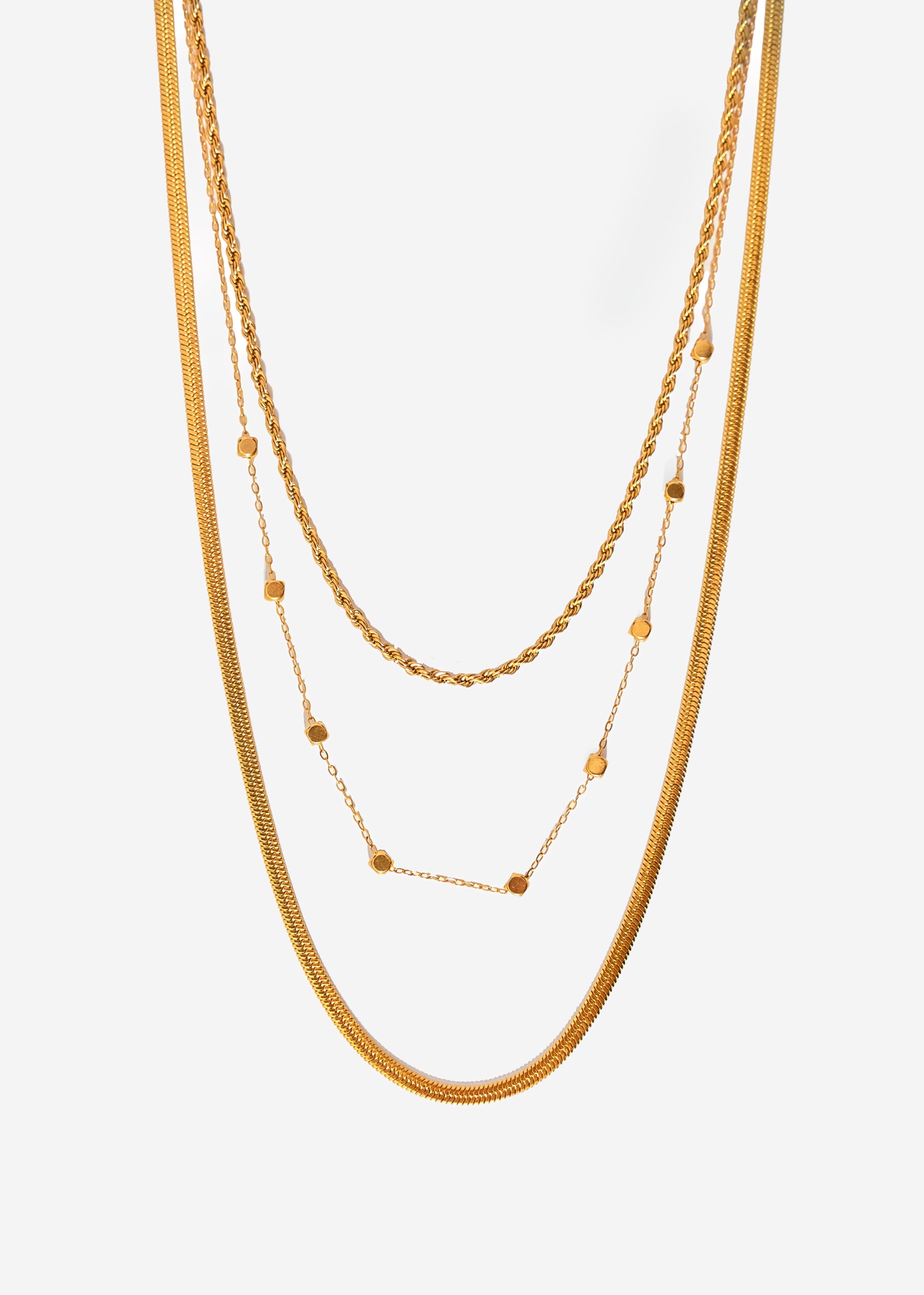 Mehrreihige goldfarbene Kette mit feinen Gliedern und zarten Kugel-Details. Kombiniert verschiedene Kettenstrukturen für einen eleganten, modernen Layering-Look.