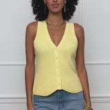 Strick-Top mit feiner Rippstruktur und durchgehender Knopfleiste. Der tiefe V-Ausschnitt und das ärmellose Design verleihen dem Modell eine feminine, moderne Silhouette.