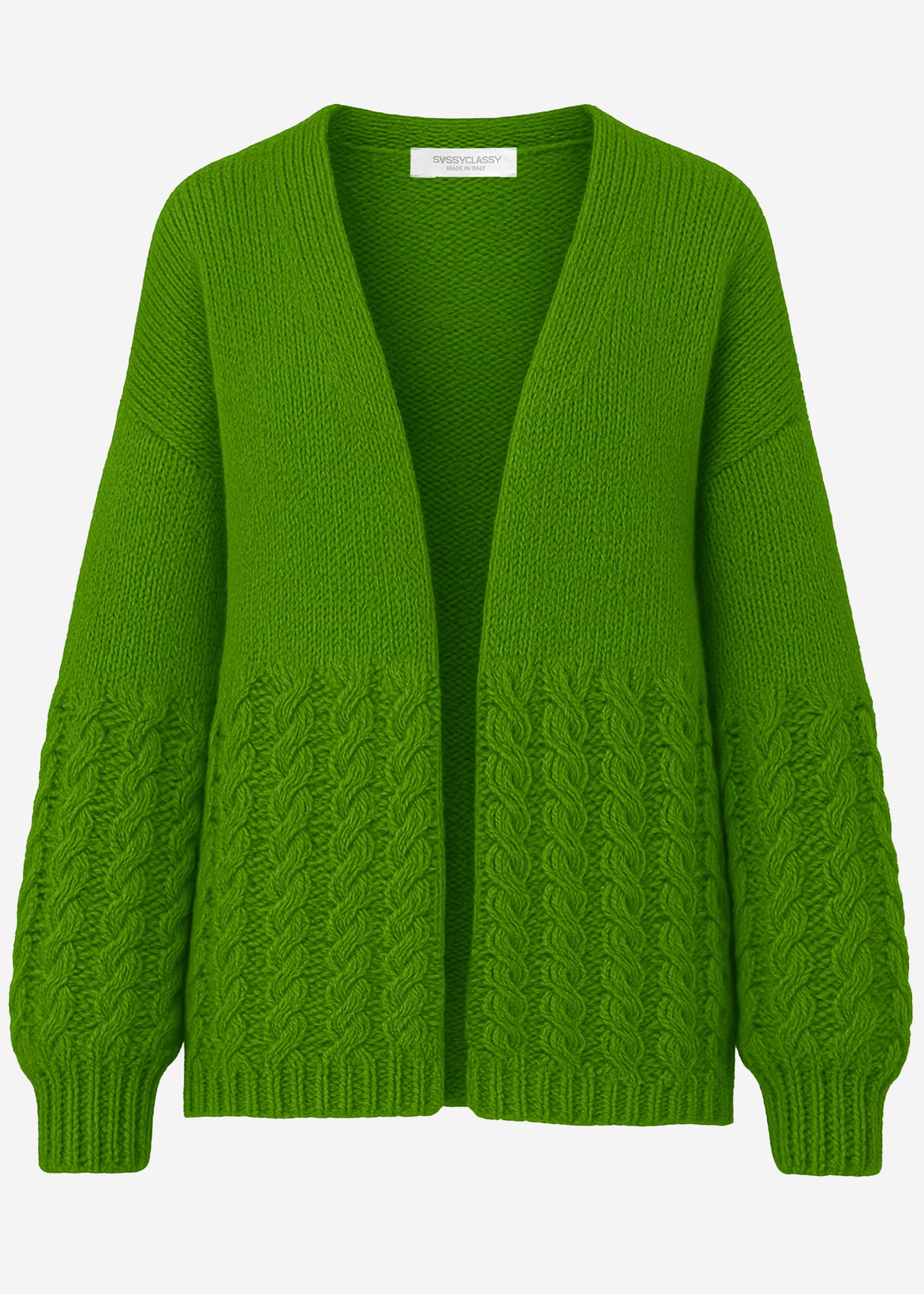 Dieser kuschelige Cardigan verbindet femininen Charme mit lässiger Gemütlichkeit. Das aufwendig gearbeitete Zopfmuster an Ärmeln und Rücken verleiht dem Strickstück eine besondere Struktur und macht es zu einem echten Blickfang. Dank des offenen Schnitts lässt sich der Cardigan vielseitig kombinieren – ob entspannt zu Jeans und T-Shirt oder elegant über einem Kleid. Das weiche Strickmaterial sorgt für ein angenehmes Tragegefühl und hält an kühleren Tagen wohlig warm. Ein modisches Highlight, das Komfort und Stil perfekt verbindet!