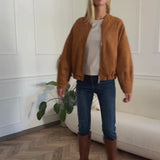 Lässig, weich und im Trend - diese Bomberjacke aus hochwertigem Wildlederimitat ist der ideale Begleiter für die Übergangszeit. Der warme Braunton bringt einen natürlichen Look in deine Garderobe, während das Soft-Touch-Material für ein besonders angenehmes Tragegefühl sorgt. Der lässige, leicht oversized Schnitt sorgt für eine moderne Silhouette. Liebevolle Details wie feine Ziernähte an den Ärmeln verleihen der Jacke das gewisse Etwas und machen sie zu einem stilistischen Highlight. Der klassische Bomber-Style mit Reißverschluss und elastischem Saum lässt sich vielseitig kombinieren - ob lässig zu Jeans und T-Shirt oder als lässiger Stilbruch über einem femininen Kleid.