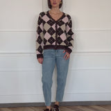 Braune Strickjacke mit dekorativem Rautenmuster und femininer Spitzenborte. Das strukturierte Muster verleiht dem Design eine besondere Tiefe, während die feinen Spitzendetails für eine elegante Note sorgen. Ein stilvolles Layering-Piece für moderne Alltagslooks.