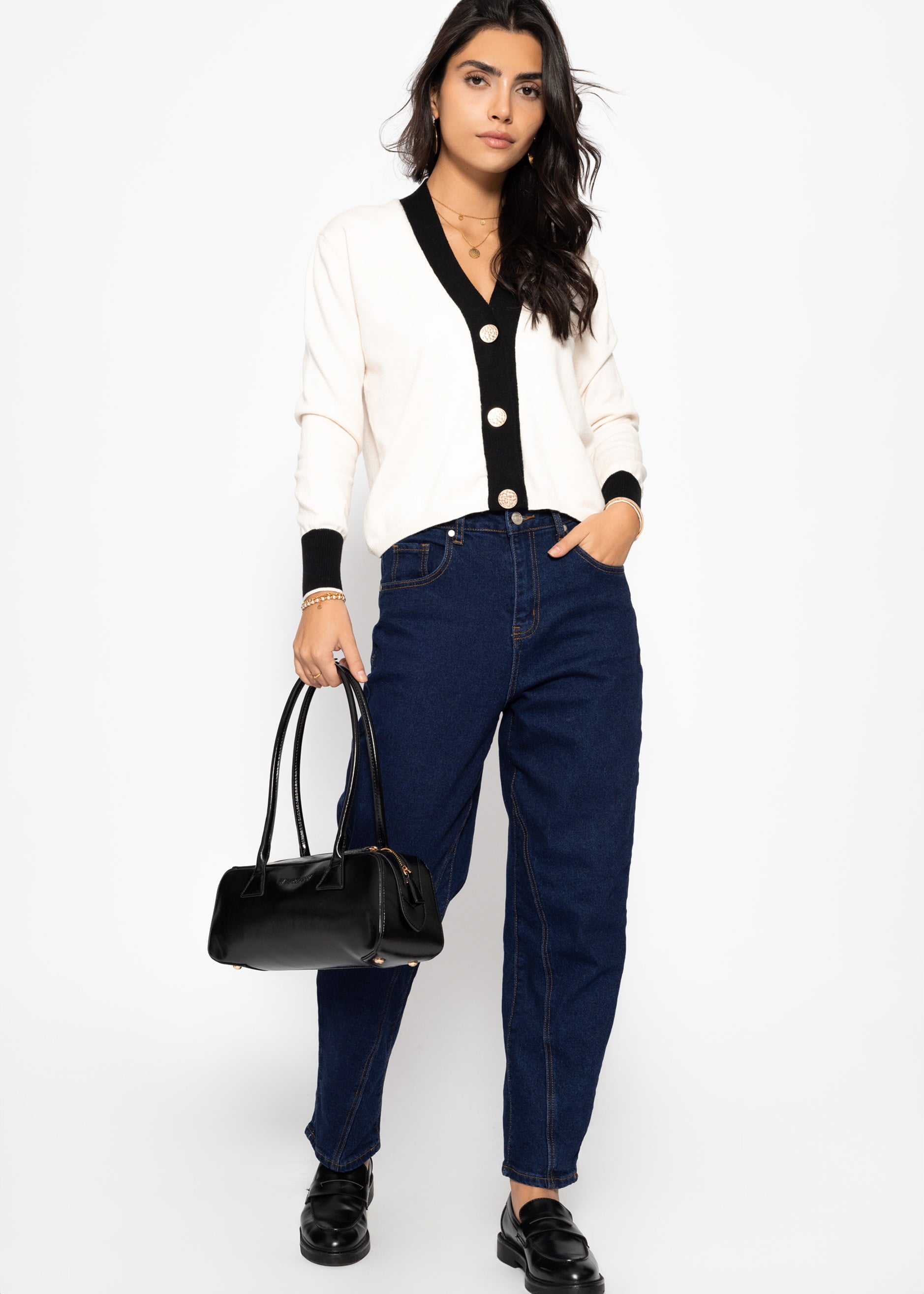 Dieser Cardigan ist ein echtes Must-have für jede Garderobe. Das Strickmaterial wird durch schwarze Abschlüsse an Kragen, Knopfleiste und Ärmelbündchen aufgelockert, was für einen stilvollen Look sorgt. Besonders edel wirken die goldfarbenen Knöpfe mit feiner Prägung, die dem Design eine raffinierte Note verleihen. Dank seines lockeren Schnitts und seiner weichen Haptik bietet der Cardigan einen hohen Tragekomfort und lässt sich vielseitig kombinieren – ob lässig zu Jeans für den Alltag oder elegant über einer Stoffhose oder einem Kleid.