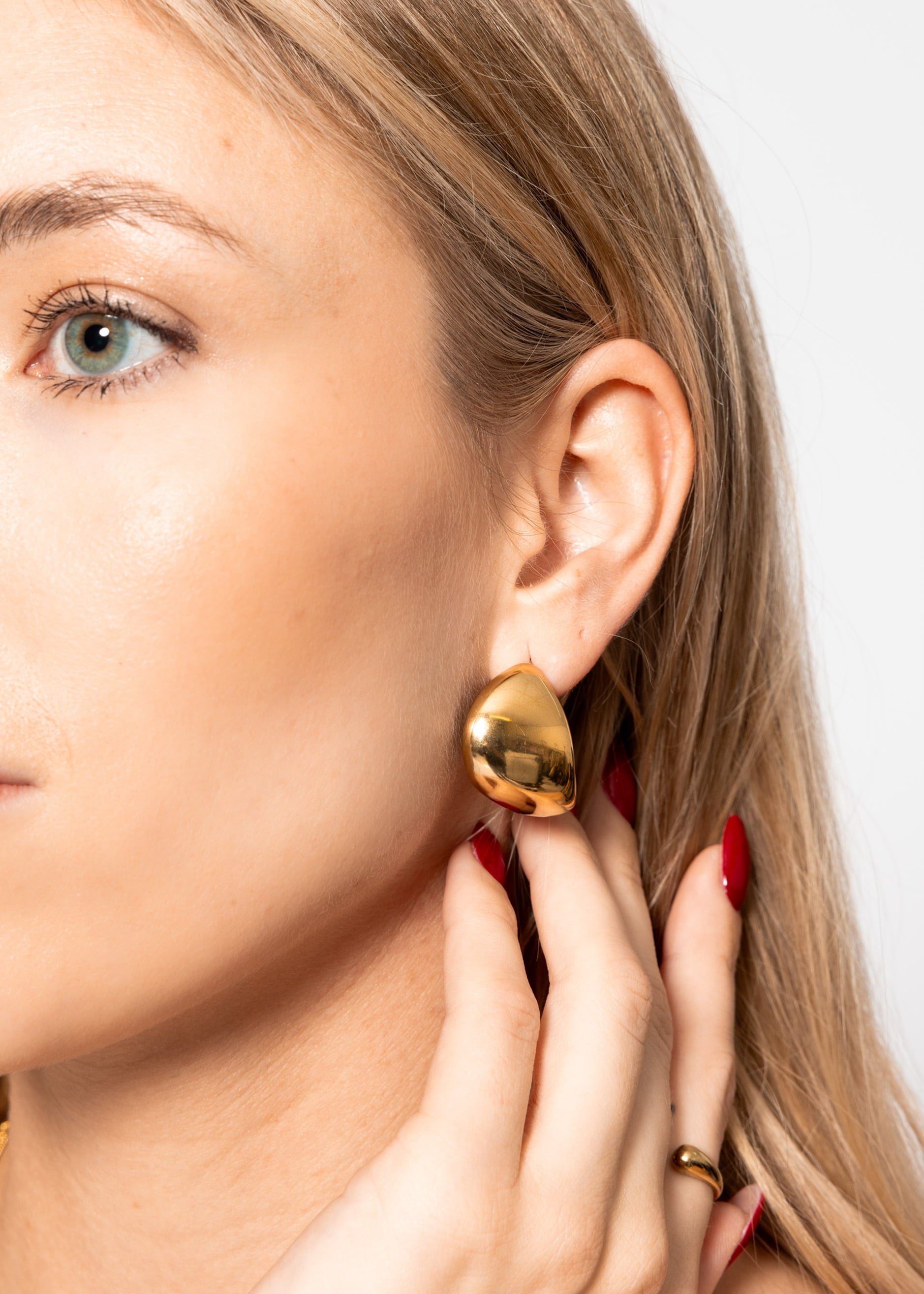 Geschwungener Ohrring aus goldfarbenem Edelstahl mit skulpturalem Design. Glänzende Oberfläche und markante Form für einen modernen, eleganten Look.
