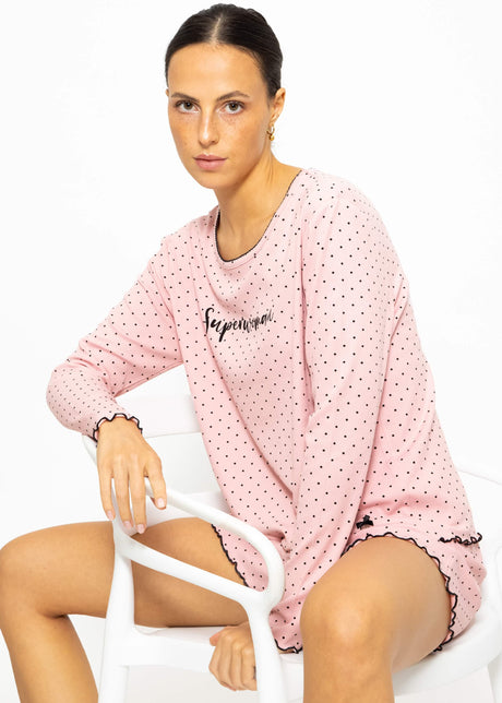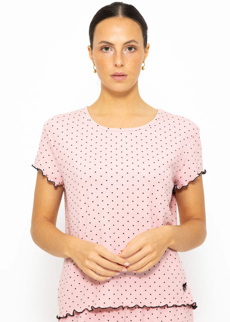 Erlebe süße Träume in diesem entzückenden Schlaftop in lockerer Passform. Das verspielte Pünktchenmuster verleiht diesem Top einen charmanten und femininen Touch, während der gewellte Saumabschluss für Raffinesse sorgt. Die verstellbaren Spaghettiträger ermöglichen eine individuelle Anpassung. Der Ausschnitt des Tops ist mit zarter Spitze verziert, die nicht nur einen Hauch von Eleganz verleiht, sondern auch das Dekolleté auf subtile Weise betont. Die gebrandete Schleife am Saum setzt einen eleganten Akzent und unterstreicht die hochwertige Verarbeitung. Hergestellt aus angenehmem Material bietet dieser Schlaftop höchsten Tragekomfort während deiner nächtlichen Ruhephasen.