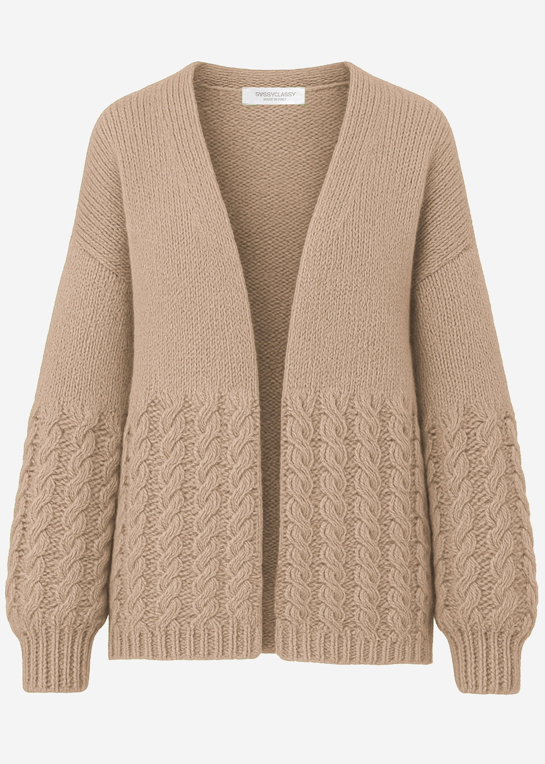 Dieser kuschelige Cardigan verbindet femininen Charme mit lässiger Gemütlichkeit. Das aufwendig gearbeitete Zopfmuster an Ärmeln und Rücken verleiht dem Strickstück eine besondere Struktur und macht es zu einem echten Blickfang. Dank des offenen Schnitts lässt sich der Cardigan vielseitig kombinieren – ob entspannt zu Jeans und T-Shirt oder elegant über einem Kleid. Das weiche Strickmaterial sorgt für ein angenehmes Tragegefühl und hält an kühleren Tagen wohlig warm. Ein modisches Highlight, das Komfort und Stil perfekt verbindet!