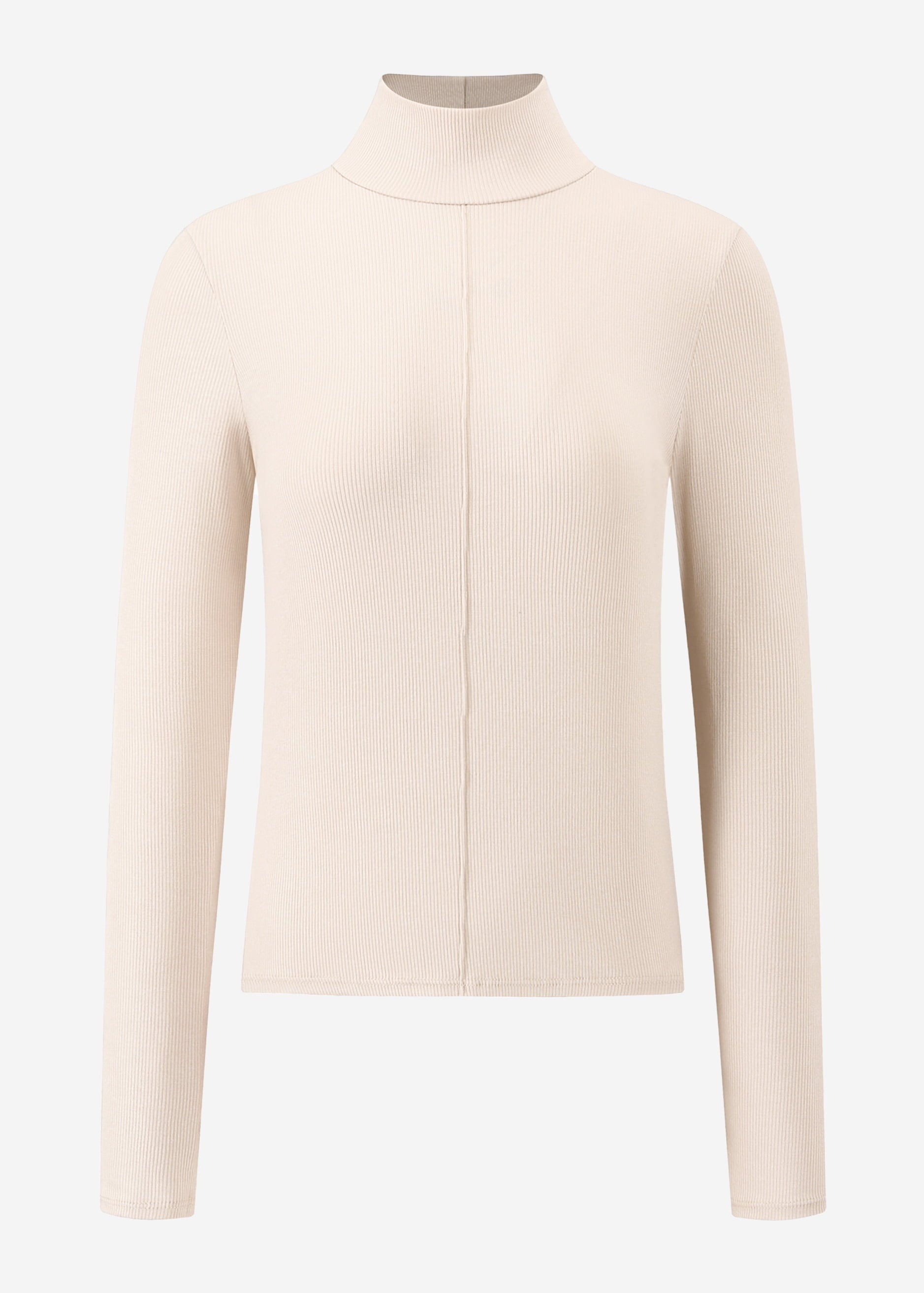 Dieses enganliegende Langarmshirt aus geripptem Viskose-Jersey hat einen Rollkragen. Eine längslaufende Biese in der Mitte betont die Figur.