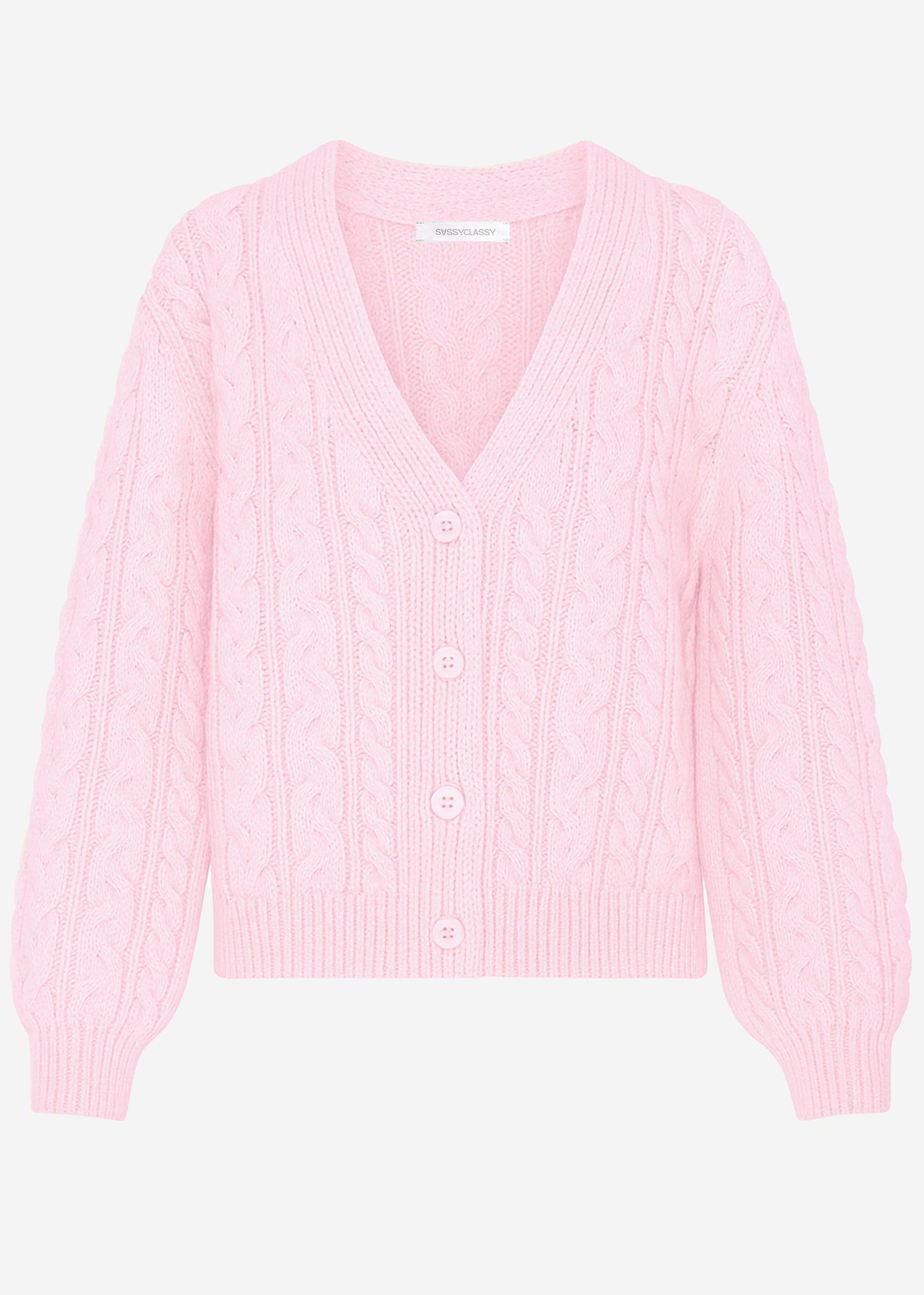 Diese rosa Strickjacke mit Zopfmuster ist aus kuschelig weichem Material gefertigt. Sie verfügt über einen V-Ausschnitt und farblich passende Knöpfe.