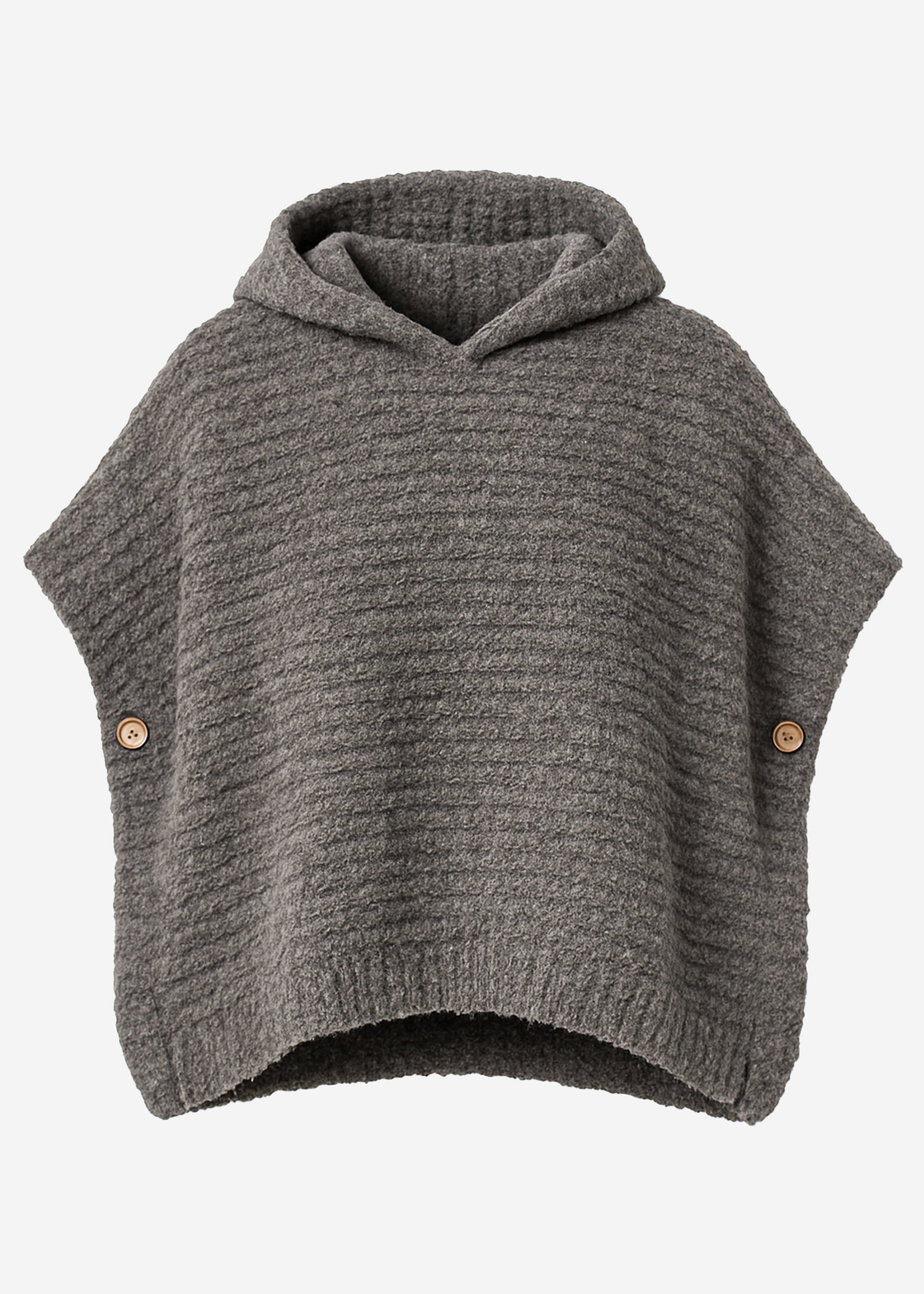 Flauschiger Strick-Pullunder in Oversize mit kastiger Silhouette und seitlichen Knopfdetails. Die Kapuze und der gerippte Strick sorgen für einen lässigen Look und angenehme Wärme. Perfekt für entspannte Layering-Outfits über Longsleeves oder leichte Strickteile.