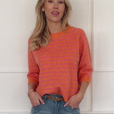 Gestreiftes Strickoberteil in leuchtenden Orange- und Pinktönen mit feinem, gleichmäßigem Streifenbild. Der lockere Schnitt und die weiche Strickqualität sorgen für eine entspannte, moderne Silhouette. Die halblangen Ärmel unterstreichen den lässigen Charakter des Designs.