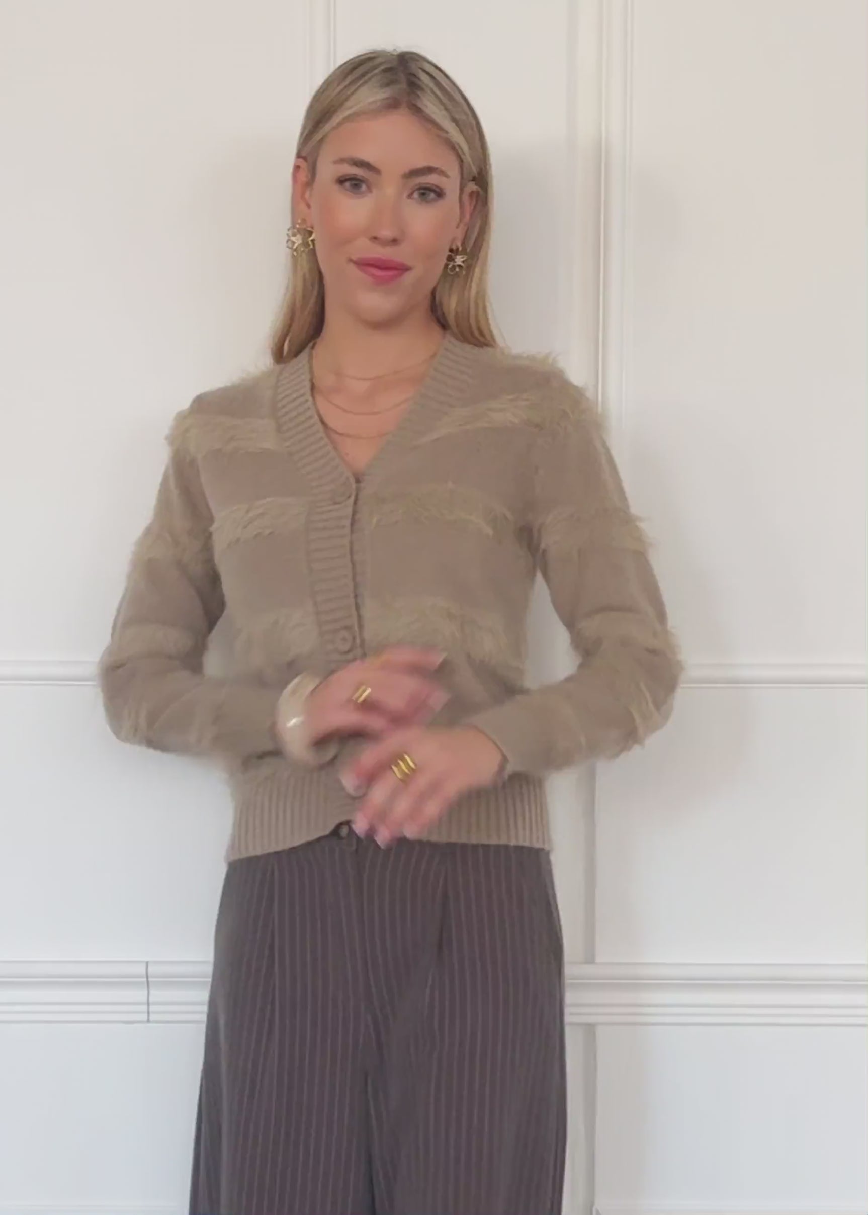 Zarte Strickjacke in Taupe mit flauschigen Streifen als besonderem Blickfang. Der feine V-Ausschnitt und die klassische Knopfleiste verleihen dem Modell eine feminine Note, während die weiche Strickstruktur für hohen Wohlfühlfaktor sorgt. Ideal für stilvolle Layering-Looks im Alltag oder zu eleganten Outfits.