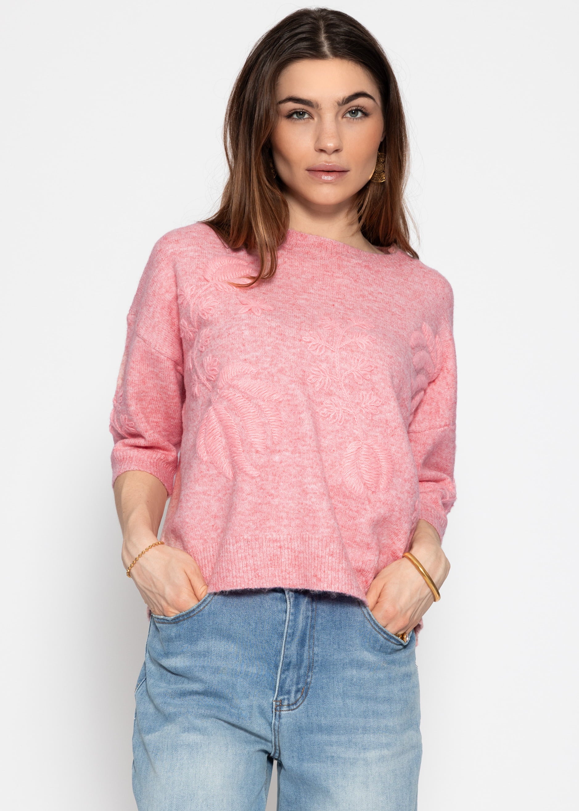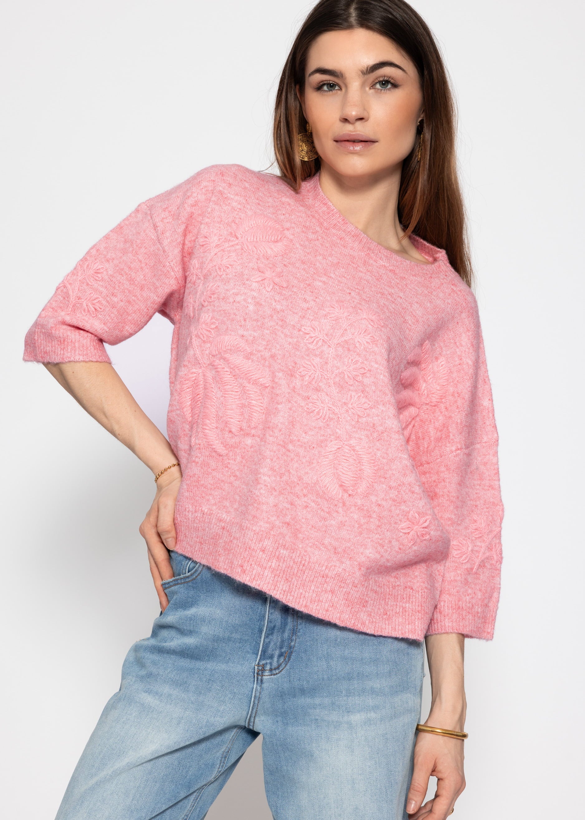 Pullover mit floraler Stickerei und plastischen Blüten- sowie Blattmotiven. Der 3/4-Arm und der klassische Rundhalsausschnitt unterstreichen den femininen Look. Rippbündchen an Saum und Ärmeln sorgen für eine schöne Passform und einen harmonischen Abschluss.