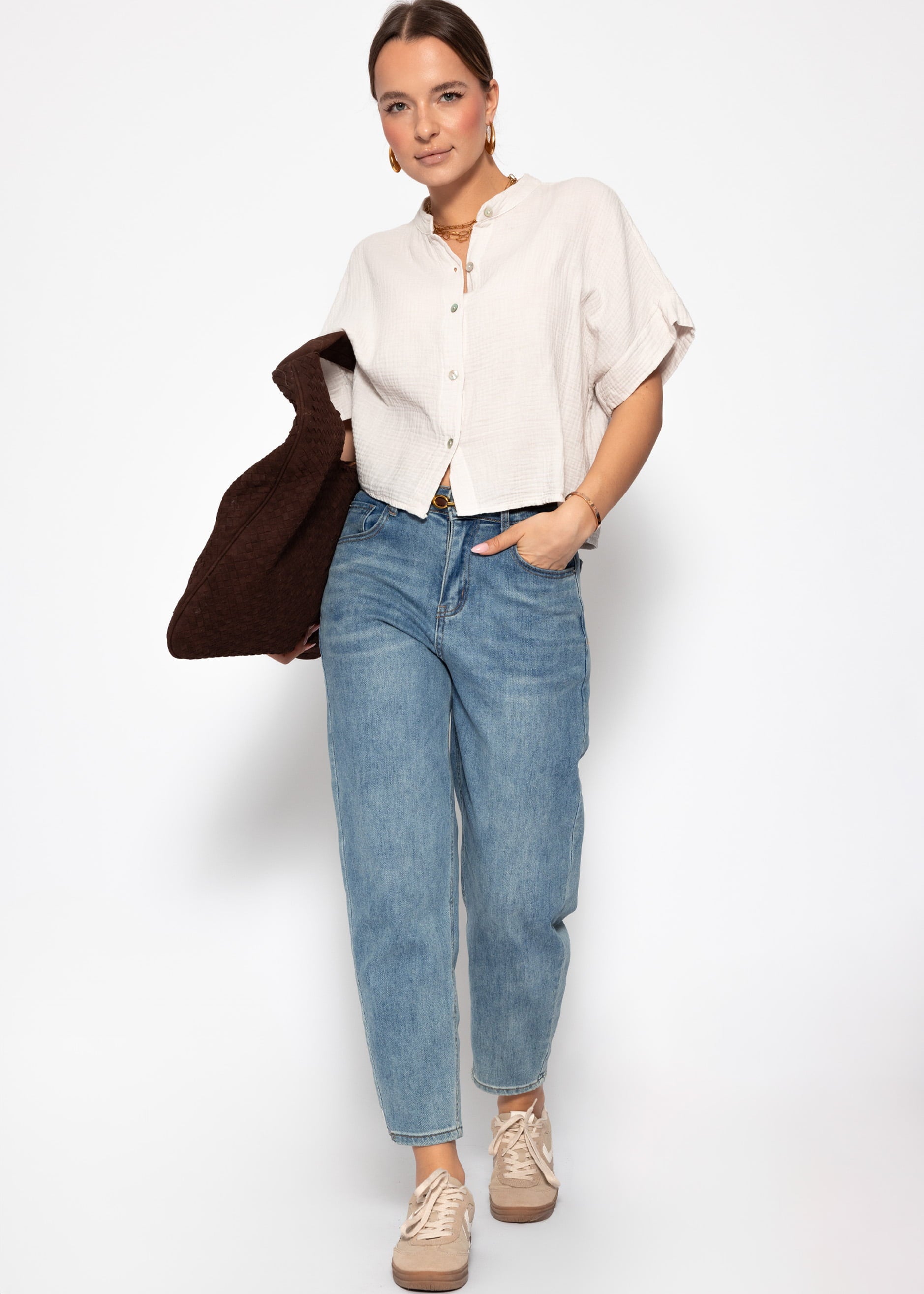 Diese Musselin Bluse in einem verkürzten Schnitt verleiht dir einen total angesagten Look. Das Modell besitzt klassische Details, wie einen Stehkragen und eine durchgehende Knopfleiste mit eleganten Perlmuttknöpfen. Kurze Ärmel, die mit Blenden versehen sind und der Oversize Schnitt geben der Bluse sportliche Details. Für einen einheitlichen Look ist eine passende Musselin Shorts erhältlich.