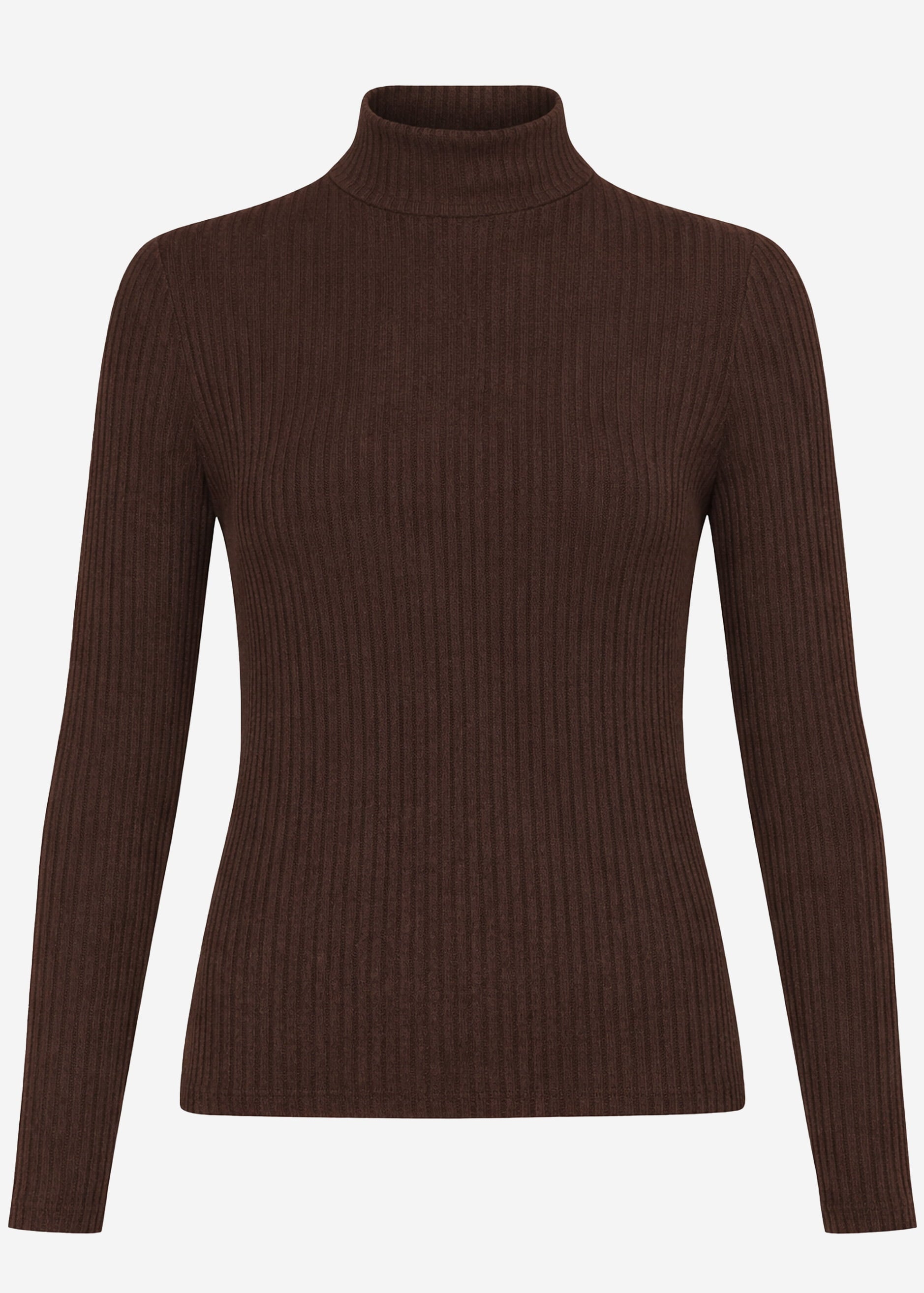 Geripptes Langarmshirt in Braun mit schmalem Stehkragen für einen cleanen, femininen Look. Die figurbetonte Passform und der weiche Stoff machen es zum vielseitigen Basic für Layering und Everyday-Outfits.