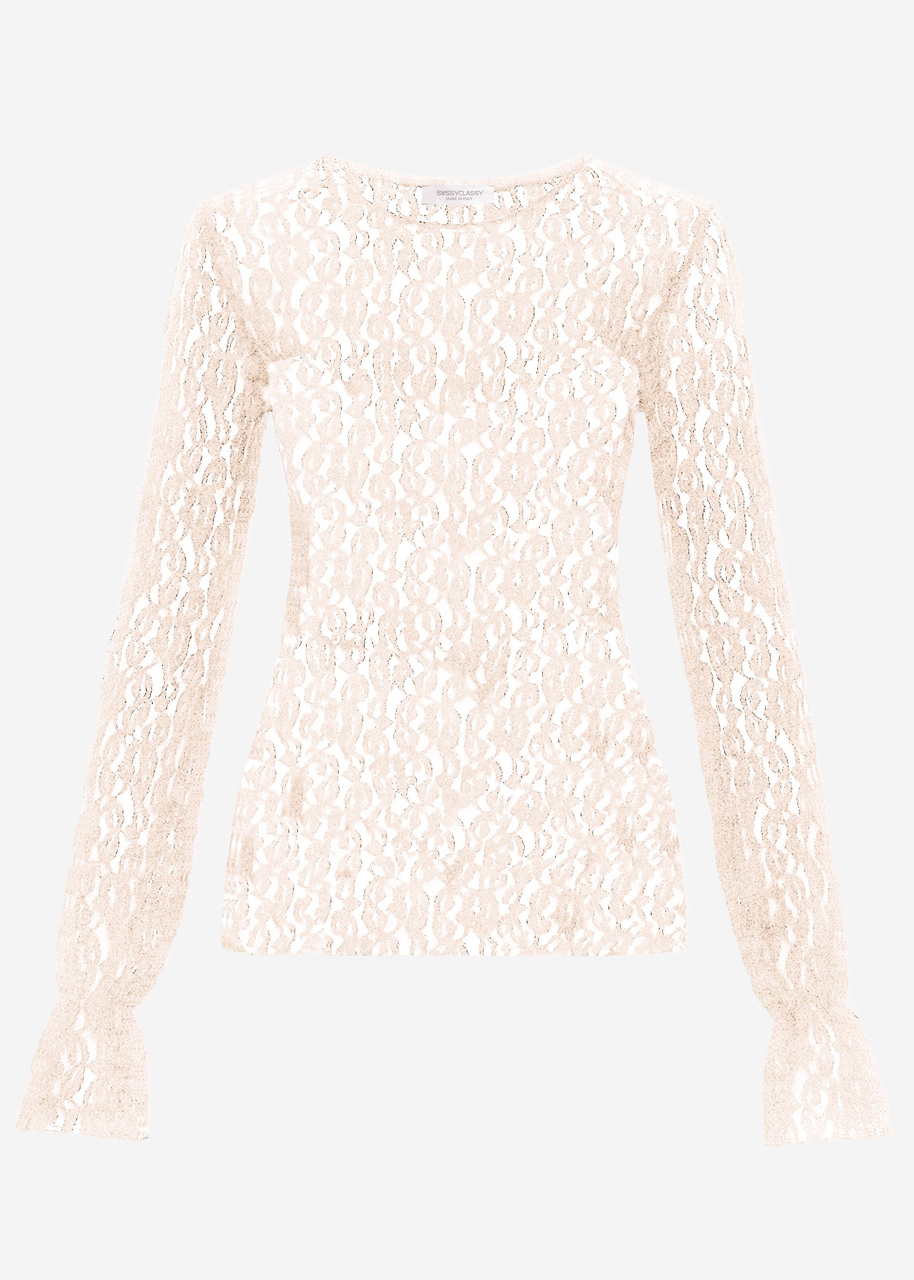 Cremefarbenes Langarmshirt aus transparenter Spitze mit floralem Muster. Figurbetonter Schnitt mit Rundhalsausschnitt und leicht ausgestellten Ärmeln. Feminine Optik durch feine Spitze und zarte Transparenz.