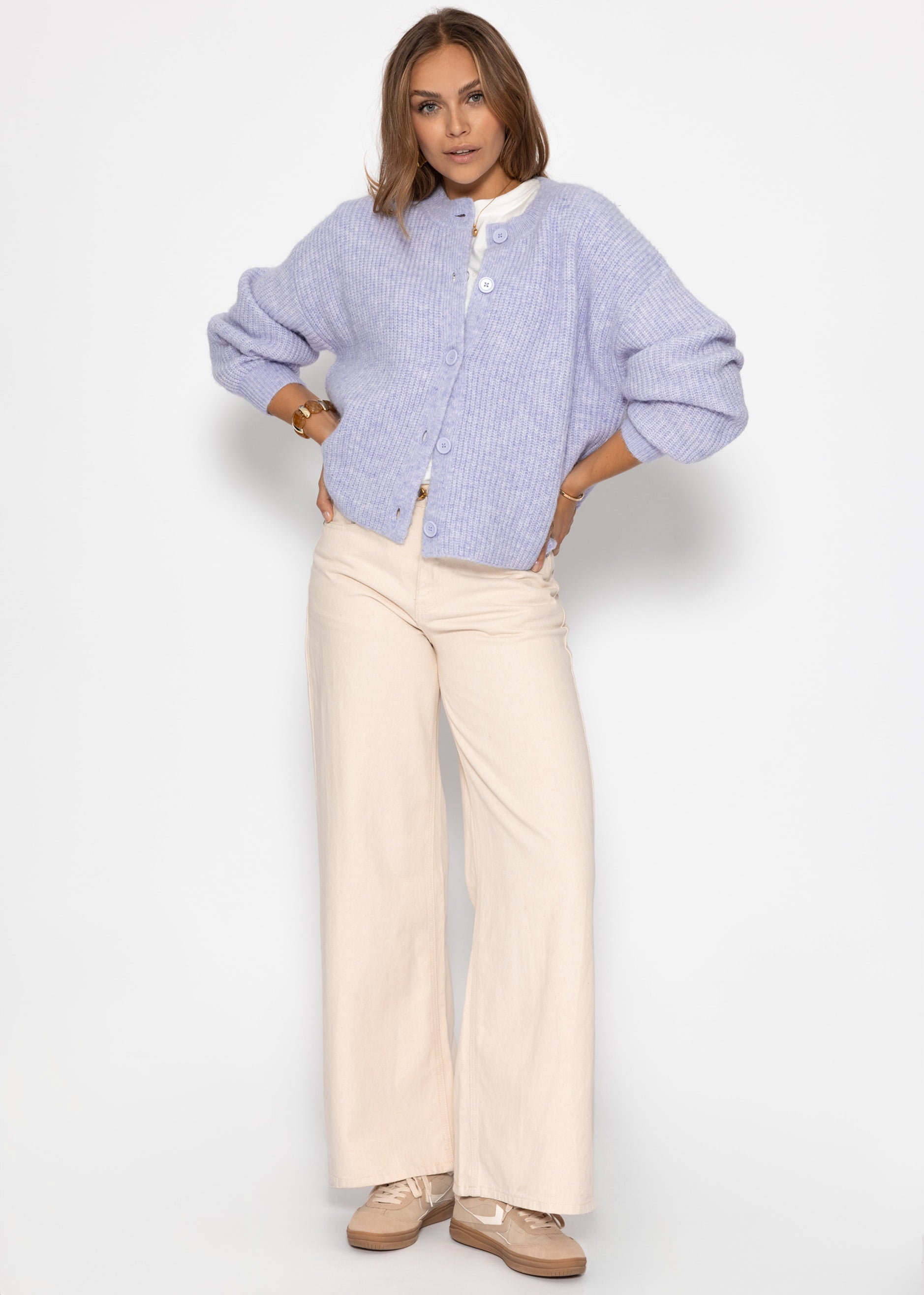 Dieser Cardigan verbindet lässigen Chic mit kuscheligem Tragekomfort. Er ist aus weichem, gestricktem Material gefertigt, das ein angenehmes Hautgefühl schenkt und wohlig warm hält. Der lockere Schnitt mit weiten Ärmeln sorgt für eine entspannte Silhouette, während die großen Knöpfe in passender Farbe dem Design eine moderne und zugleich zeitlose Note verleihen. Der Cardigan lässt sich vielseitig kombinieren – ob zu Jeans für einen lässigen Alltagslook oder zu eleganteren Hosen und Röcken für ein stilvolles Outfit. Ein vielseitiges Essential, das Komfort und Stil mühelos in Einklang bringt.