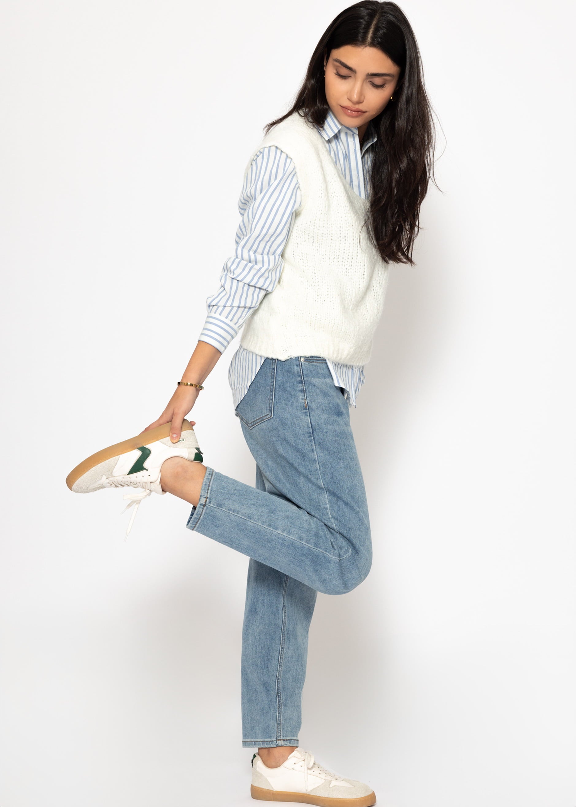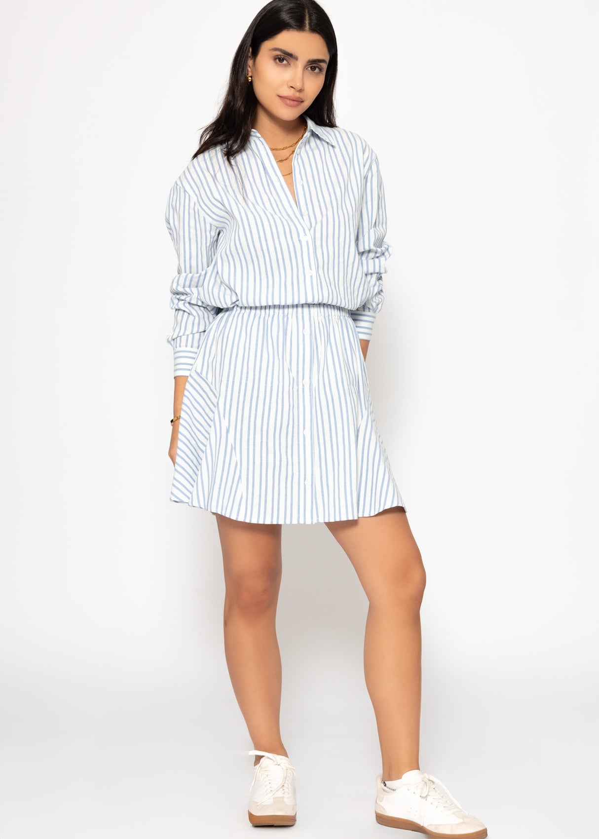 Diese elegante Bluse aus einem hochwertigen Baumwollgemisch verbindet klassisches Design mit modischer Raffinesse. Das feine Streifenmuster sorgt für einen frischen, stilvollen Look, der sowohl im Büro als auch in der Freizeit überzeugt. Dank der lockeren Passform, des klassischen Hemdkragens und der langen Ärmel mit Manschetten ist sie ein vielseitiger Begleiter, der sich perfekt zu Jeans, Stoffhosen oder Röcken kombinieren lässt. Besonders schön: Zu dieser Hemdbluse ist auch ein passender Rock erhältlich, mit dem sich ein harmonischer Co-Ord-Look kreieren lässt.