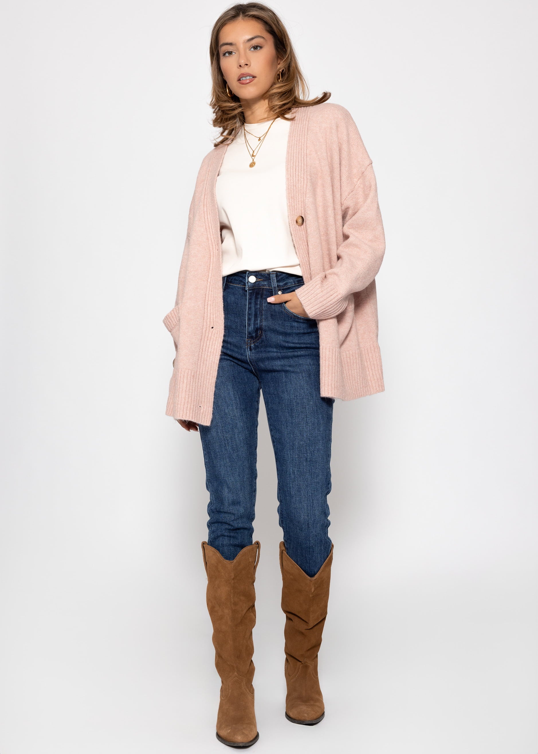 Strick-Cardigan mit markanter Rippstruktur an V-Ausschnitt, Knopfleiste und Saum. Zwei aufgesetzte Taschen und überschnittene Schultern unterstreichen den lässigen Oversize-Look. Weicher Strick sorgt für ein gemütliches Tragegefühl.