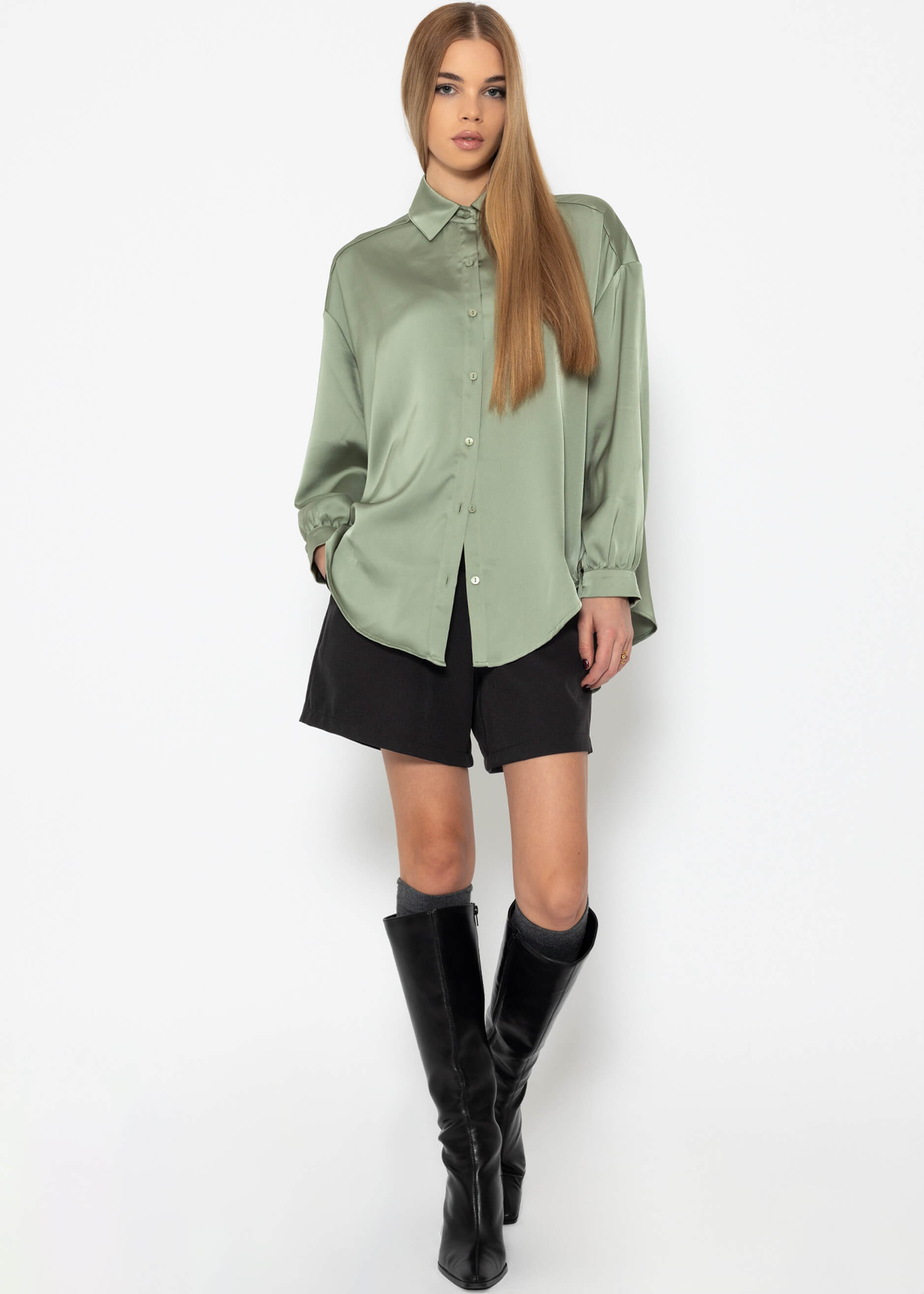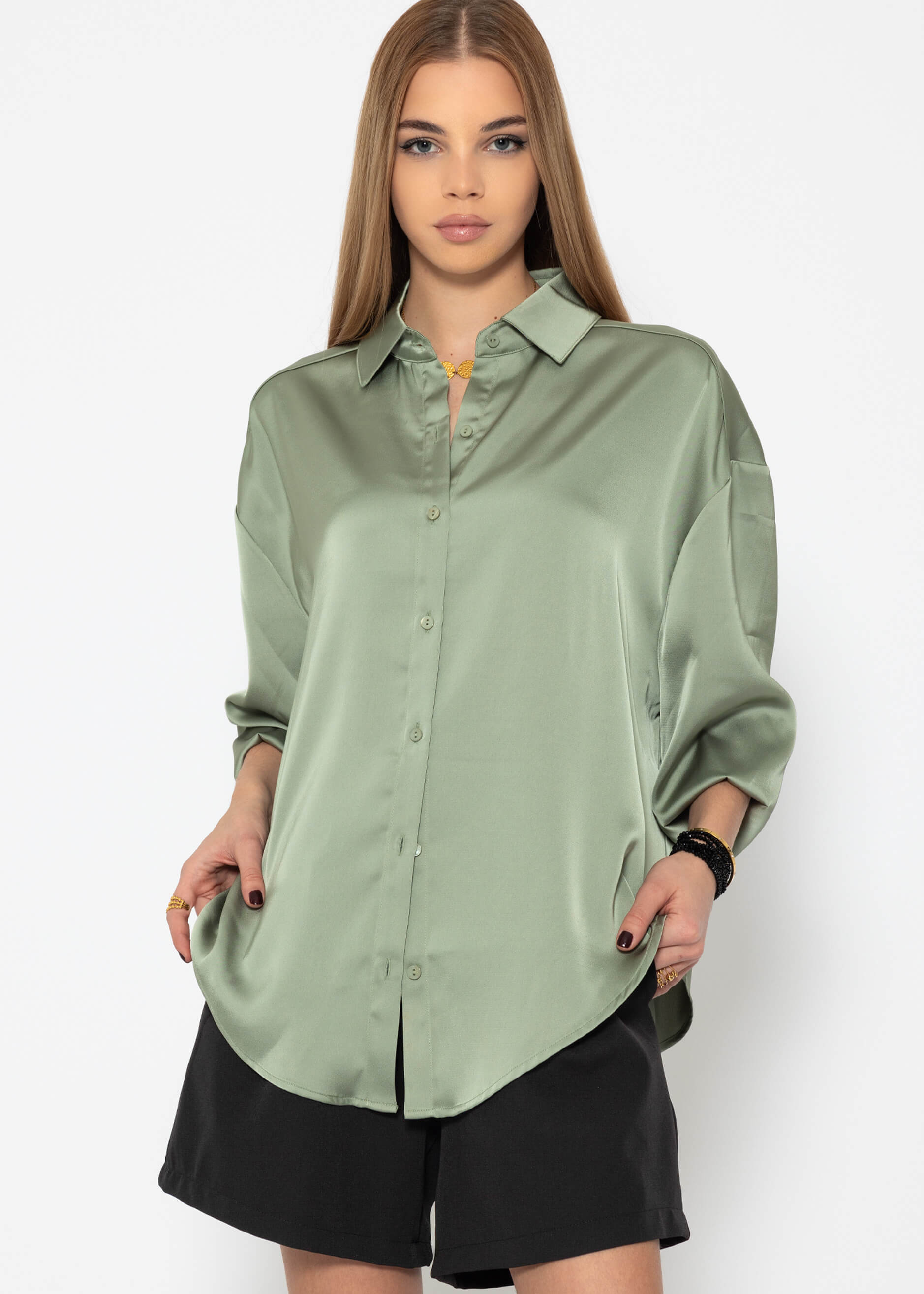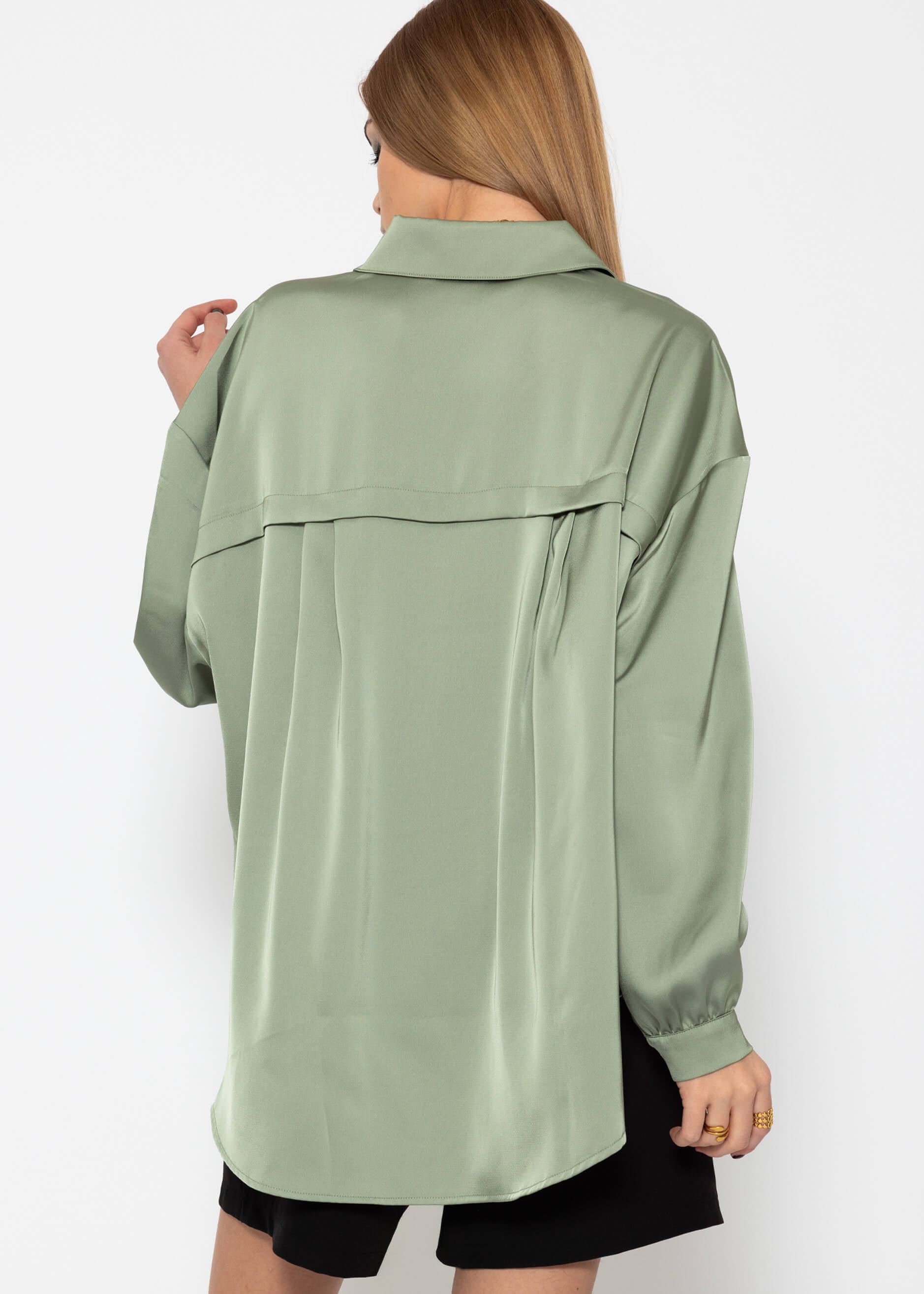 Mit ihrer einzigartigen Kombination aus schimmerndem Design und klassischen Details ist diese Oversize Bluse perfekt für besondere Anlässe oder um deinem Alltagslook eine luxuriöse Note zu verleihen. Das Modell zeichnet sich durch eine durchgehende Knopfleiste, Kragen sowie Manschetten an den langen Ärmeln aus. Die ultra Oversize Passform sorgt für einen angesagten Look und höchsten Tragekomfort. Die verlängerte Rückenpartie und die querlaufende Naht und Falte am Rücken runden das Design gekonnt ab. Empfohlen bis Gr 44