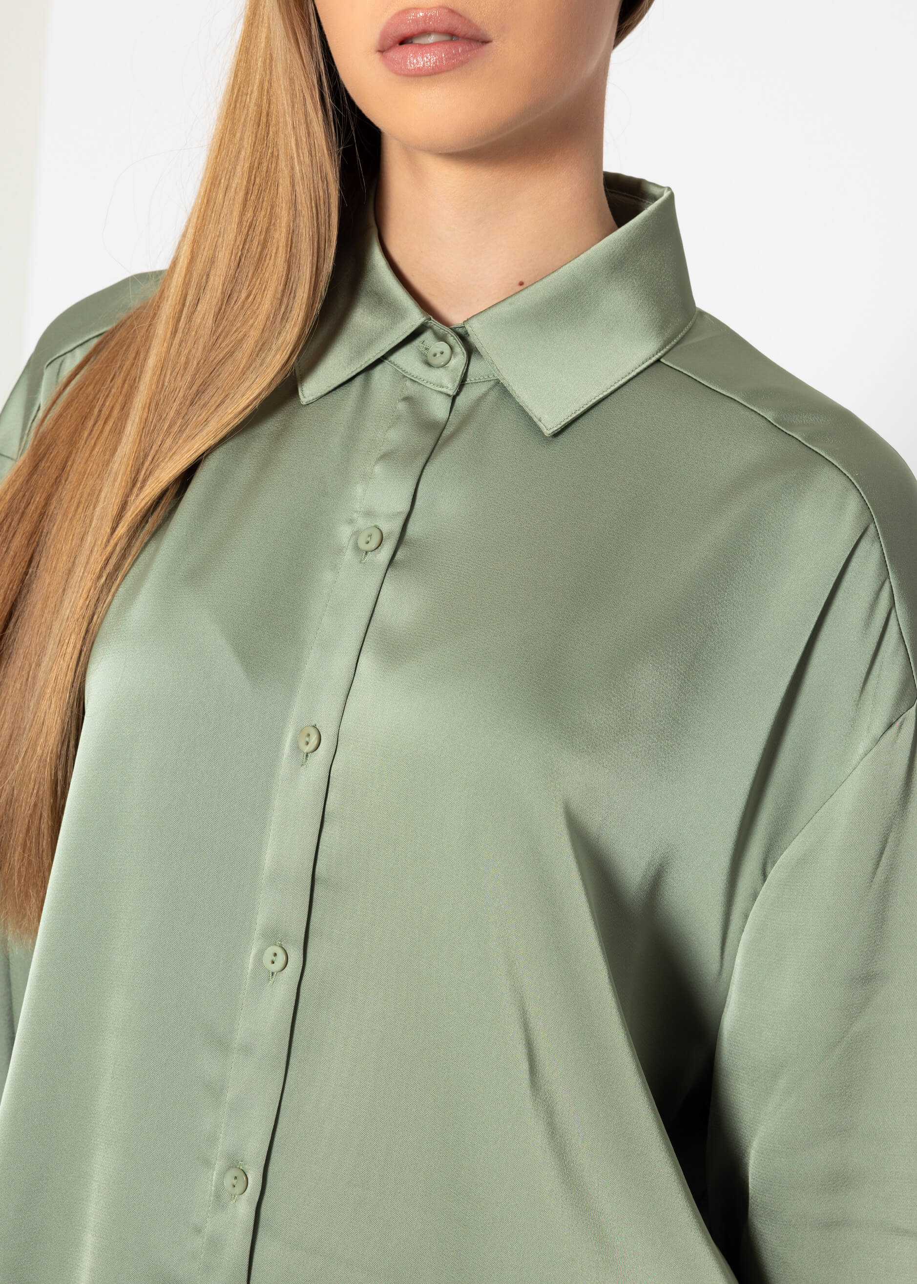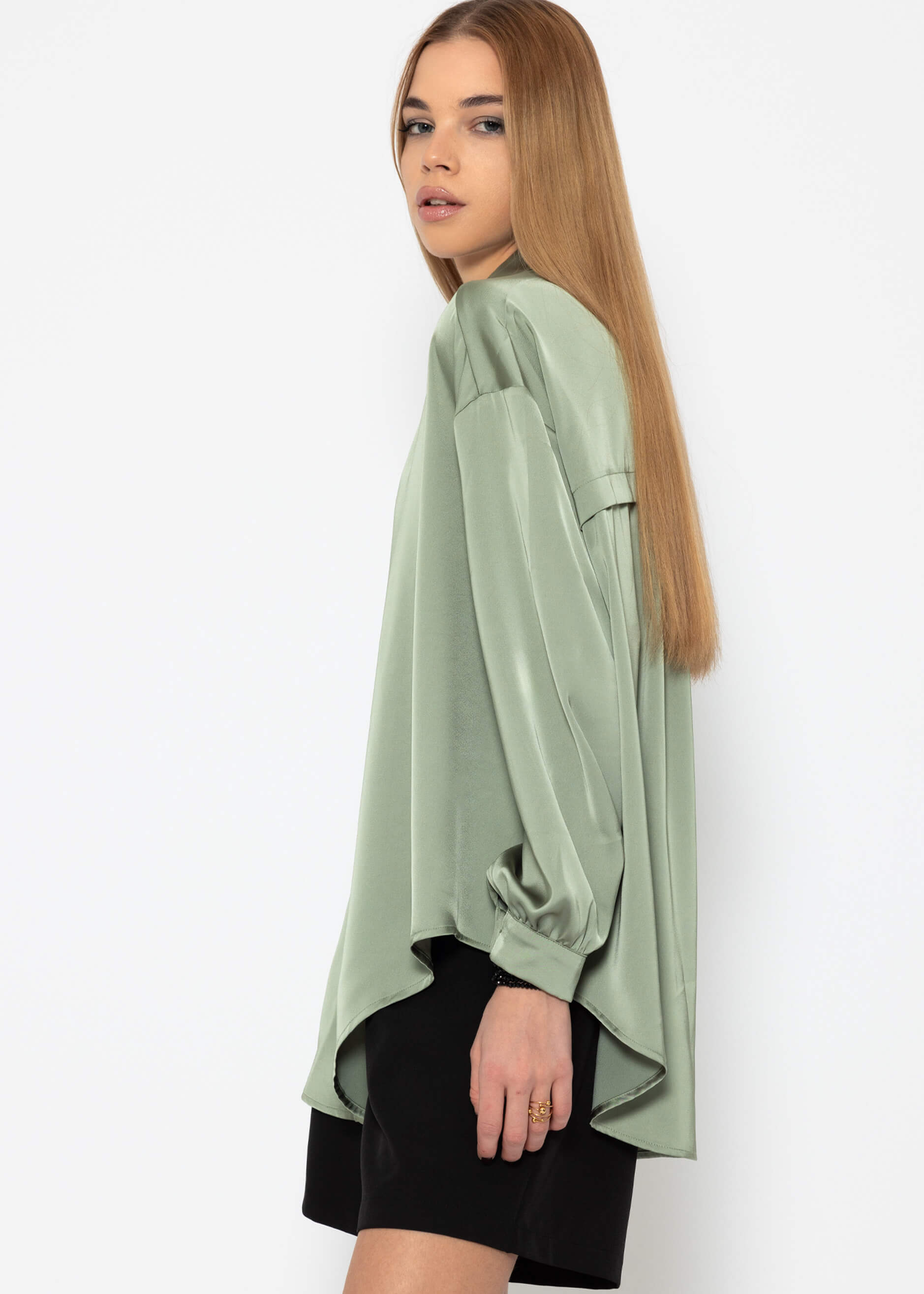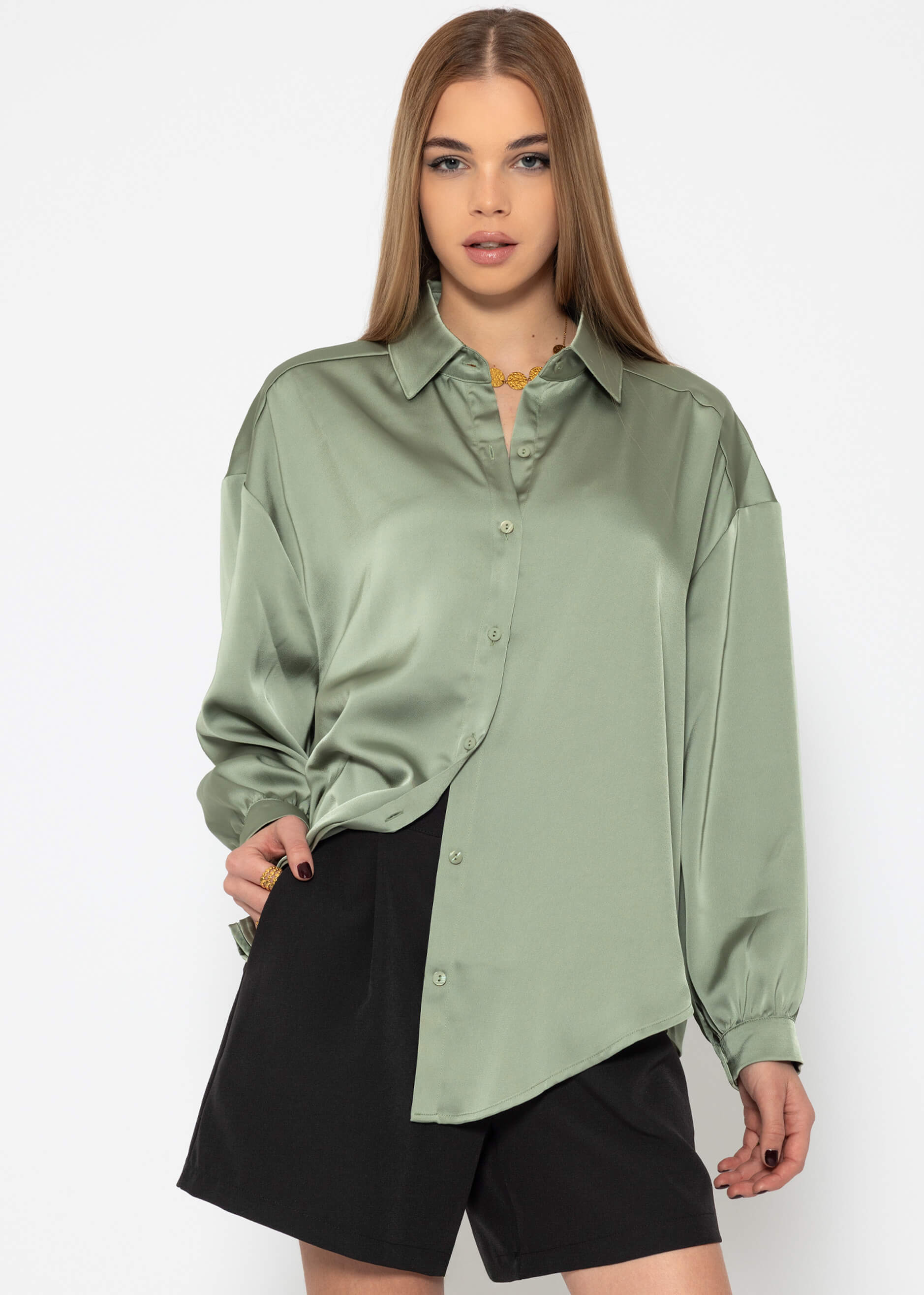Mit ihrer einzigartigen Kombination aus schimmerndem Design und klassischen Details ist diese Oversize Bluse perfekt für besondere Anlässe oder um deinem Alltagslook eine luxuriöse Note zu verleihen. Das Modell zeichnet sich durch eine durchgehende Knopfleiste, Kragen sowie Manschetten an den langen Ärmeln aus. Die ultra Oversize Passform sorgt für einen angesagten Look und höchsten Tragekomfort. Die verlängerte Rückenpartie und die querlaufende Naht und Falte am Rücken runden das Design gekonnt ab. Empfohlen bis Gr 44