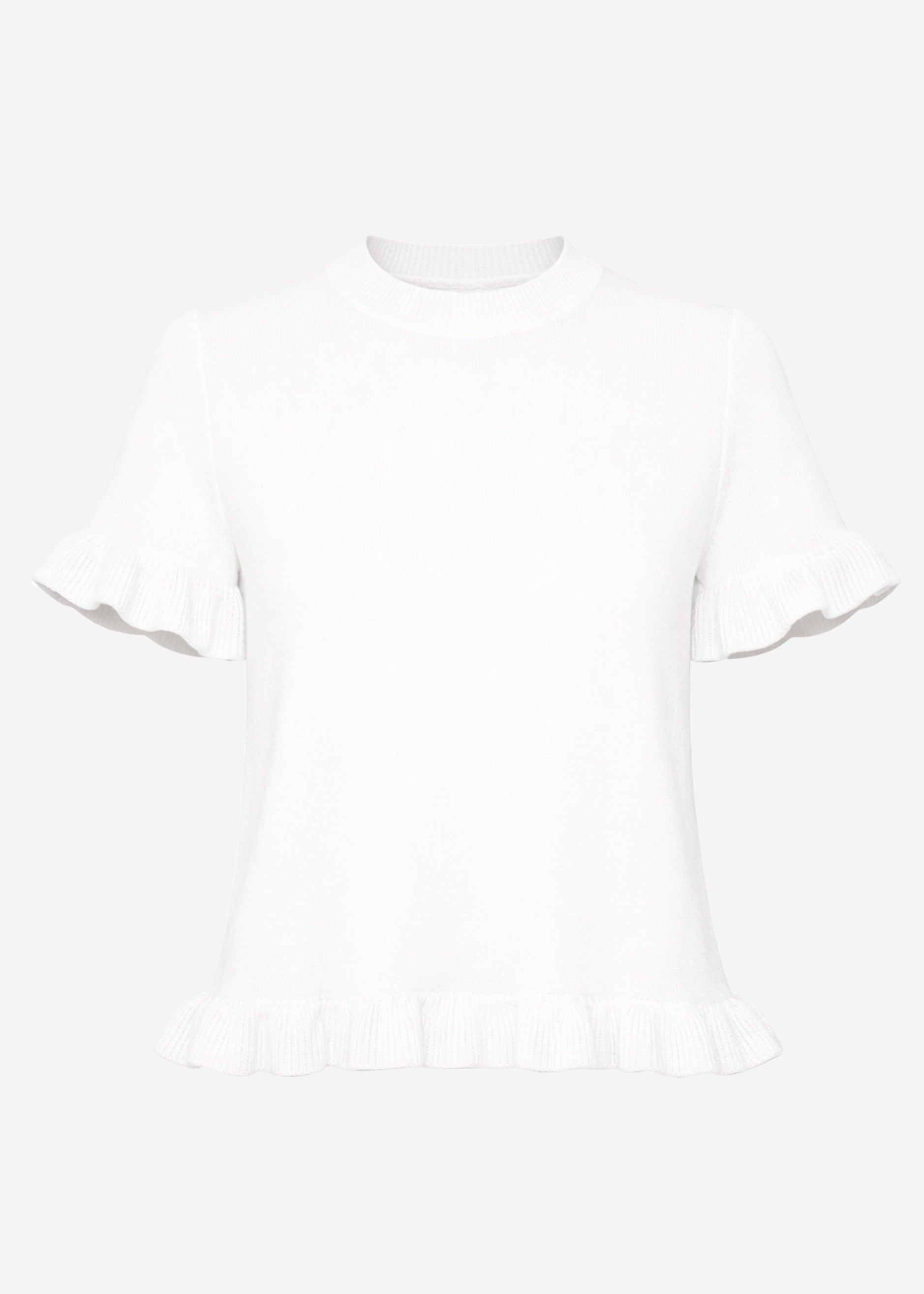 Knit T-shirt with feminine ruffles on the sleeves and hem. The classic round neckline and straight cut create a timeless silhouette. Lightweight knit with a subtly wavy hem for a playful yet elegant look.