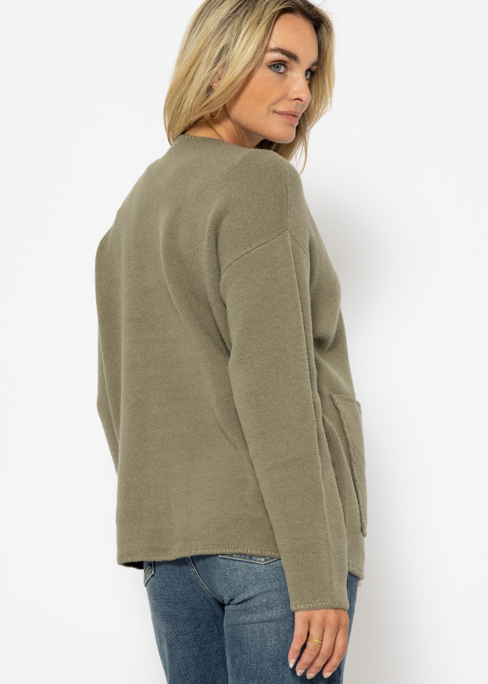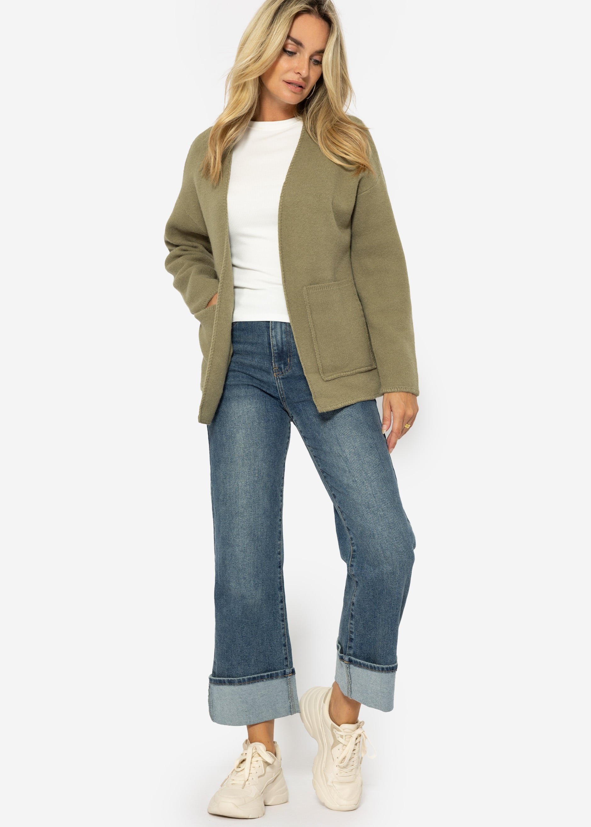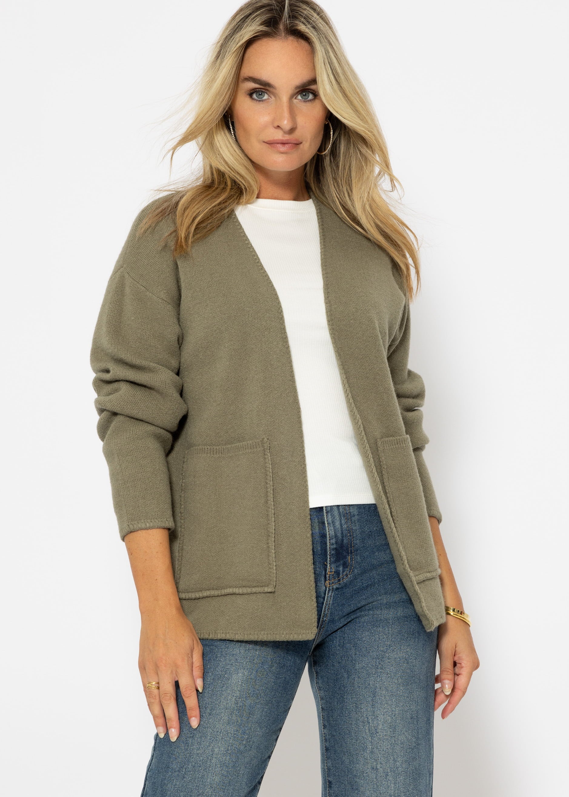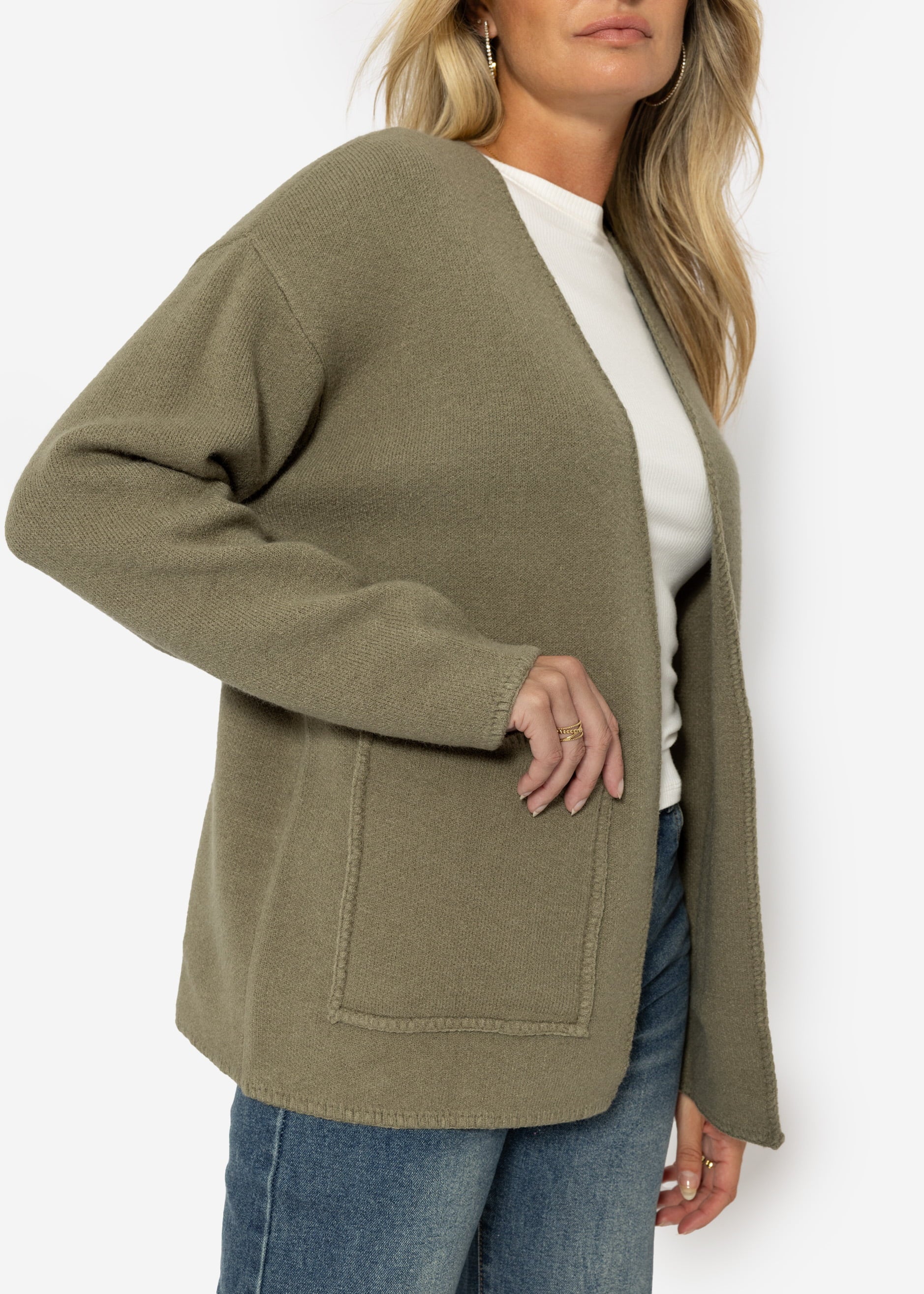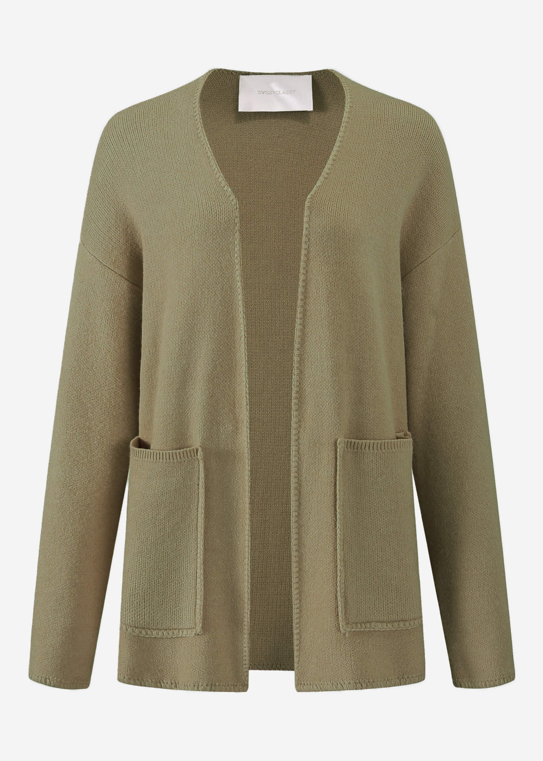 This cardigan impresses with its simple elegance and comfortable fit. It features a loose fit, long sleeves, and dropped shoulders. The open silhouette adds a casual touch to your look and allows for versatile layering. The two generous patch pockets are a highlight, lending the cardigan practical functionality as well as aesthetic appeal. The subtle tone-on-tone decorative borders running along the pockets and cuffs add elegant structure to the minimalist design. It's ideal for pairing with a simple top and jeans for a stylish everyday look.