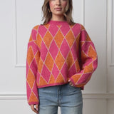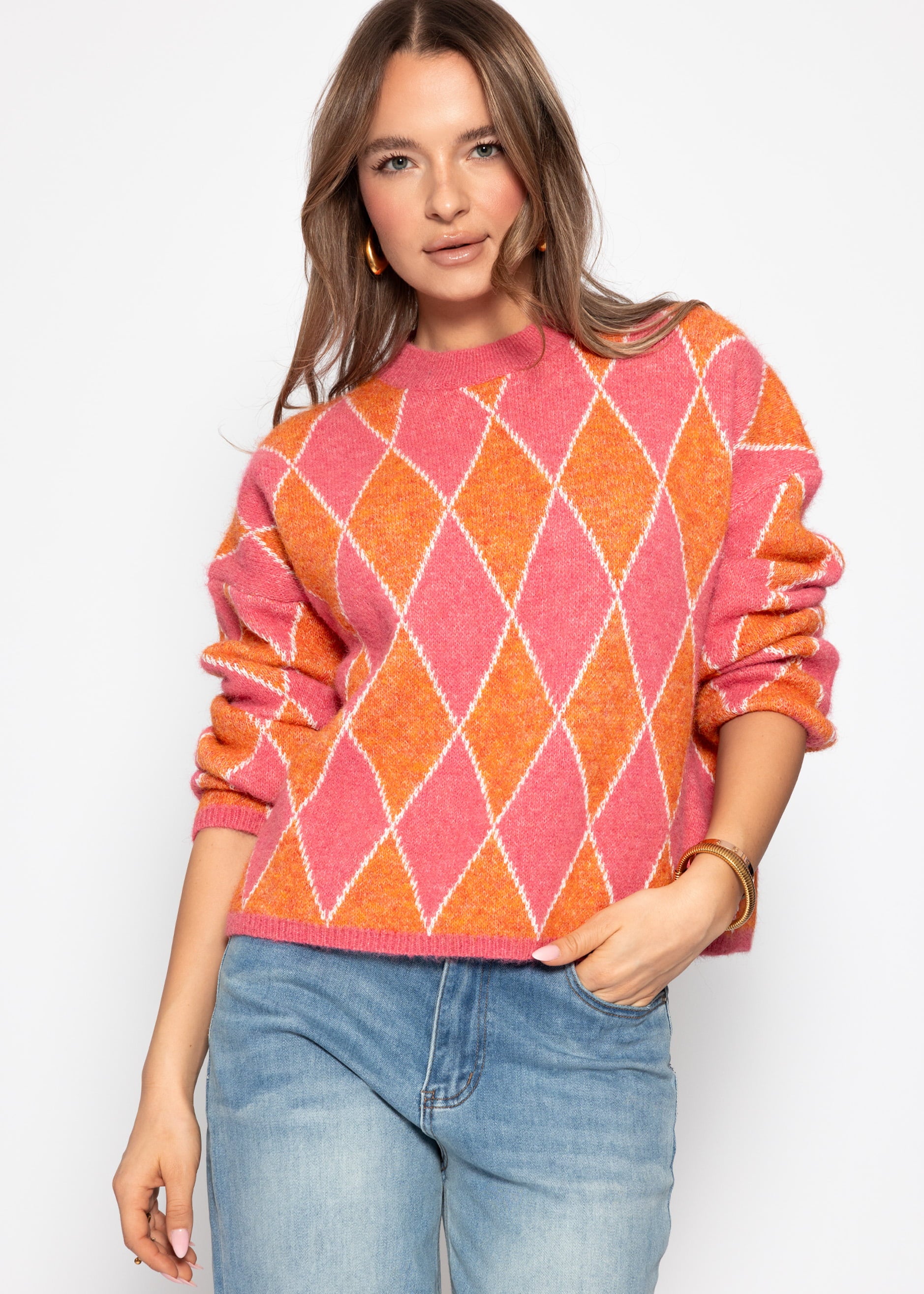 Knitted sweater with a striking argyle pattern in pink and orange. Relaxed, slightly boxy fit with a round neck and long sleeves. Soft feel and contrasting diamond details for a modern look.