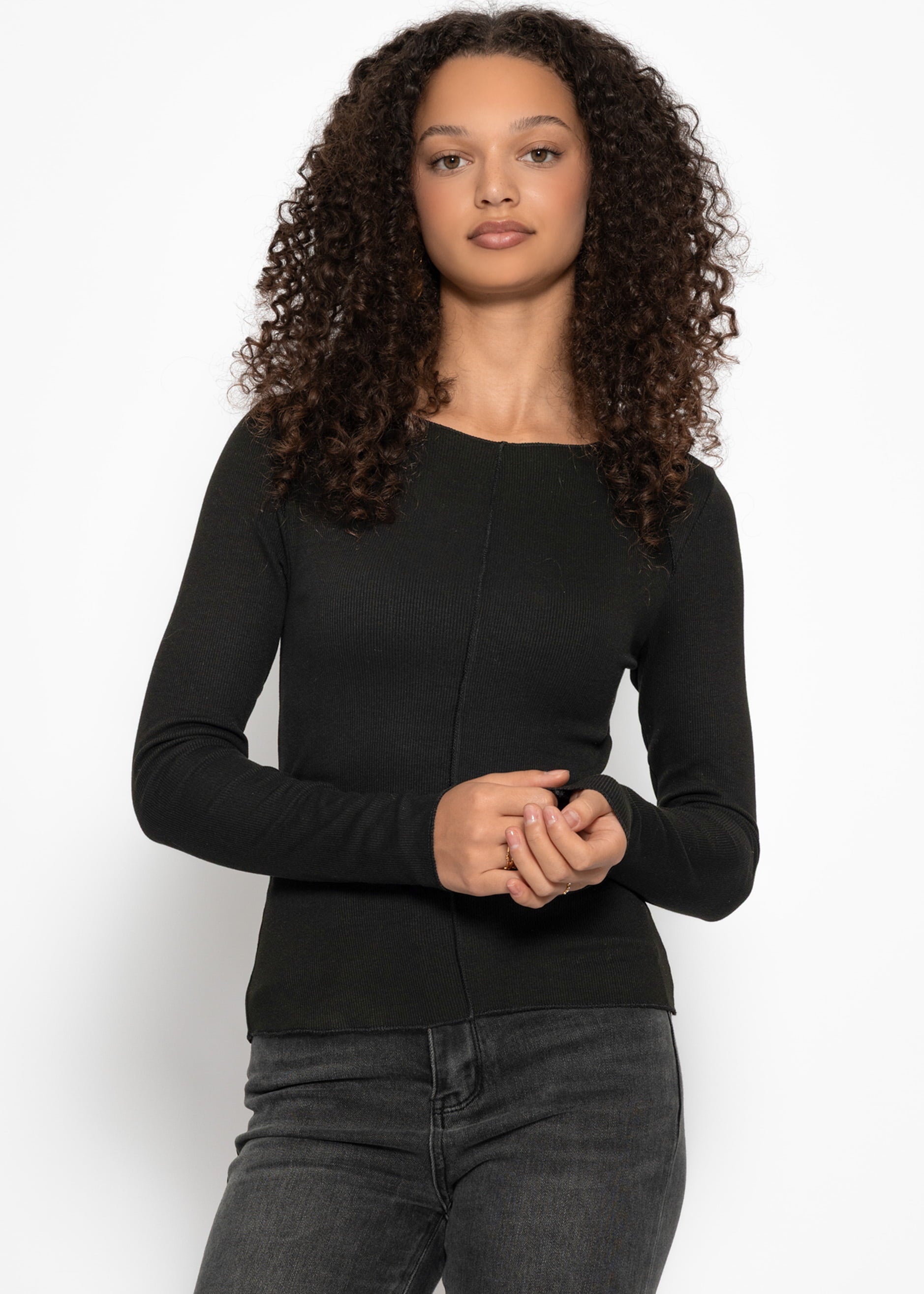 Black long-sleeved shirt with decorative stitching. Slim-fit design in soft, finely ribbed jersey with a round neckline. A simple basic for versatile combinations.